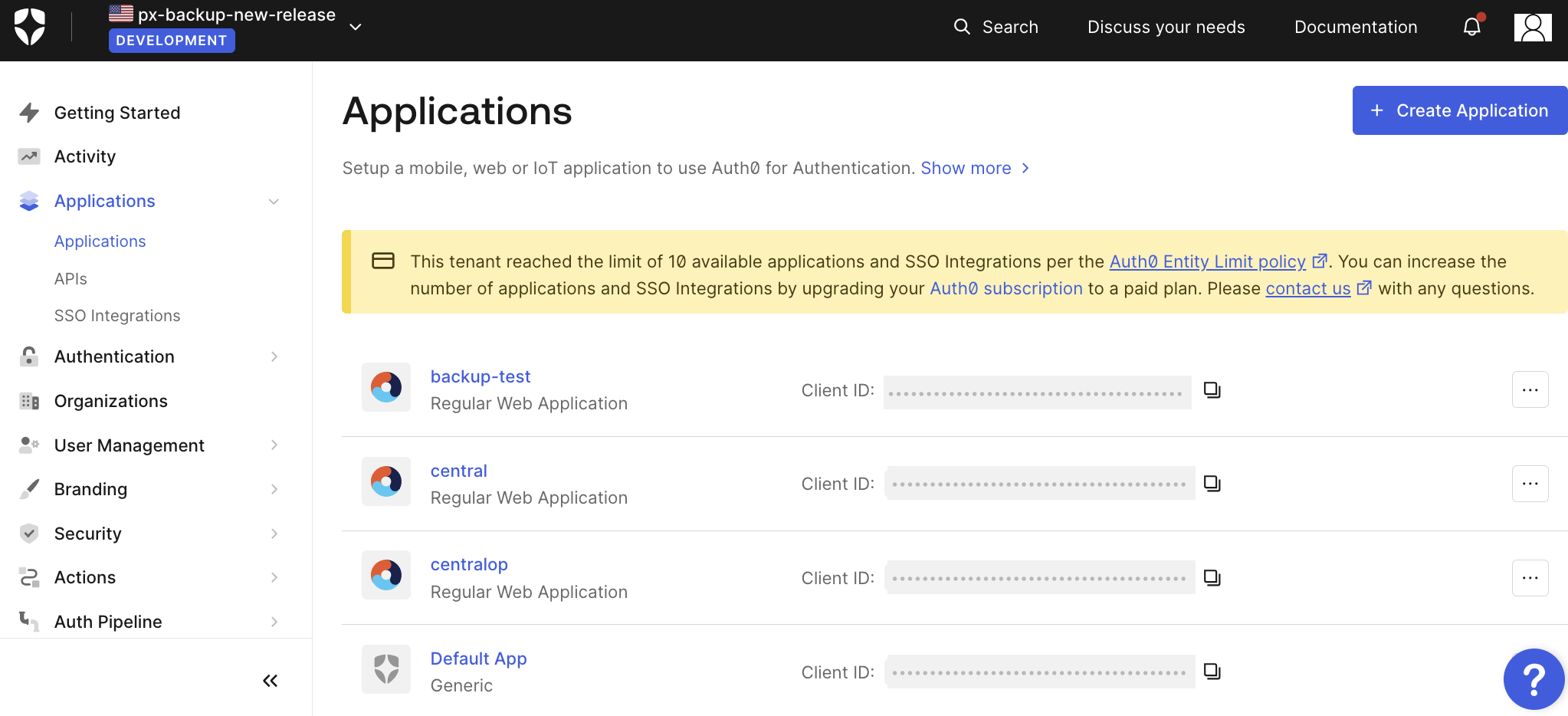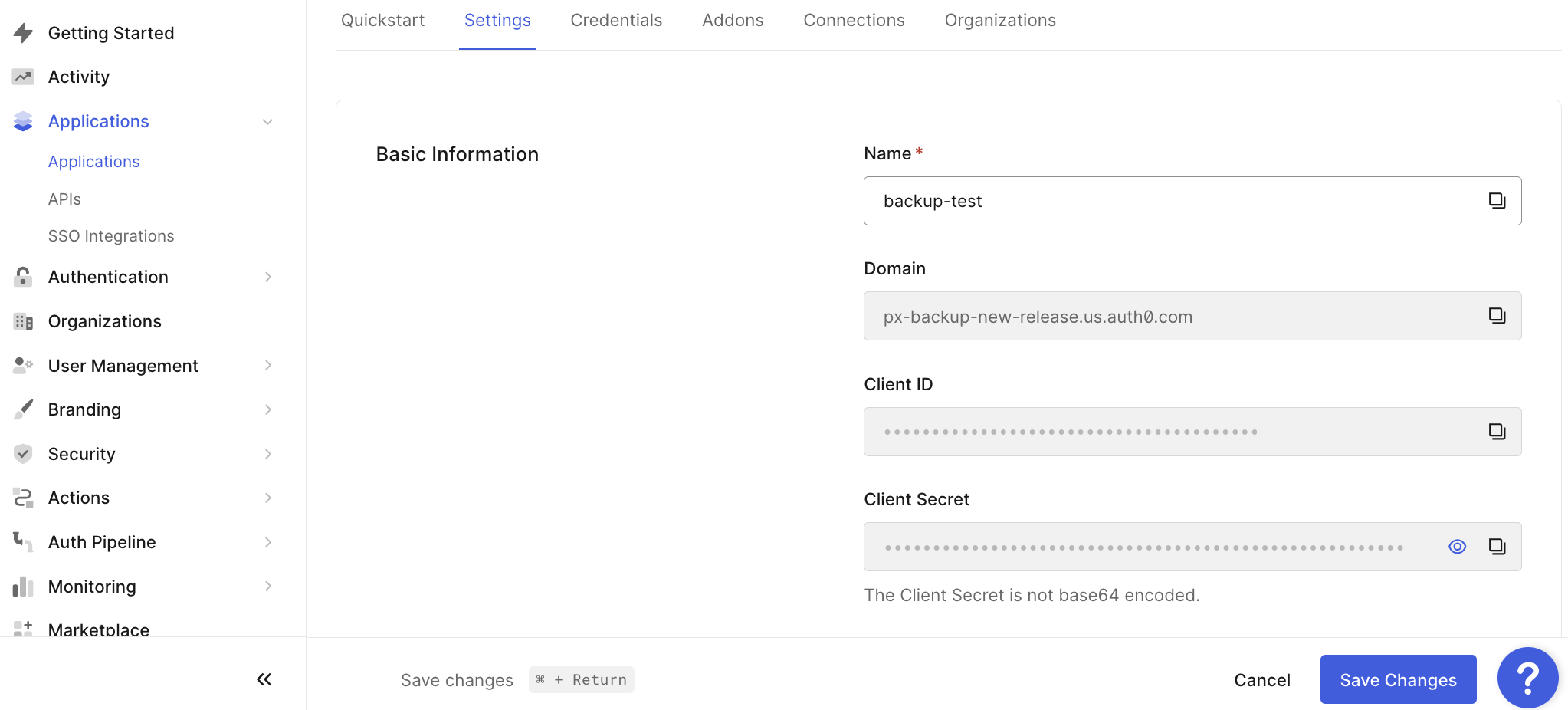 Enter the Domain (Endpoint) Client ID, and Client Secret in Portworx Backup web console during installation to integrate Auth0 as external authorization provider. Refer install Portworx Backup section for more information on these fields.