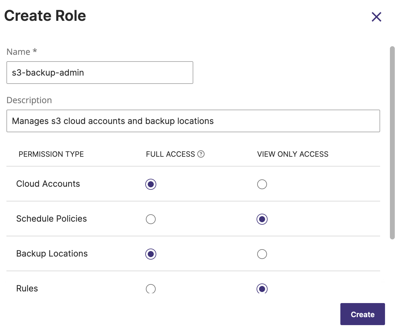 Choose either Full Access or View Only for the following Portworx Backup resources to assign the required level of access to the role you create: