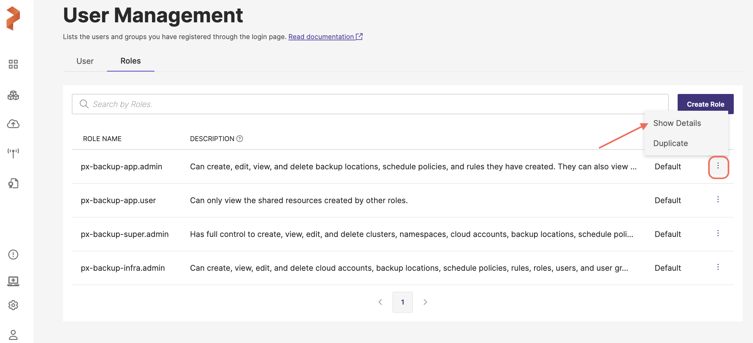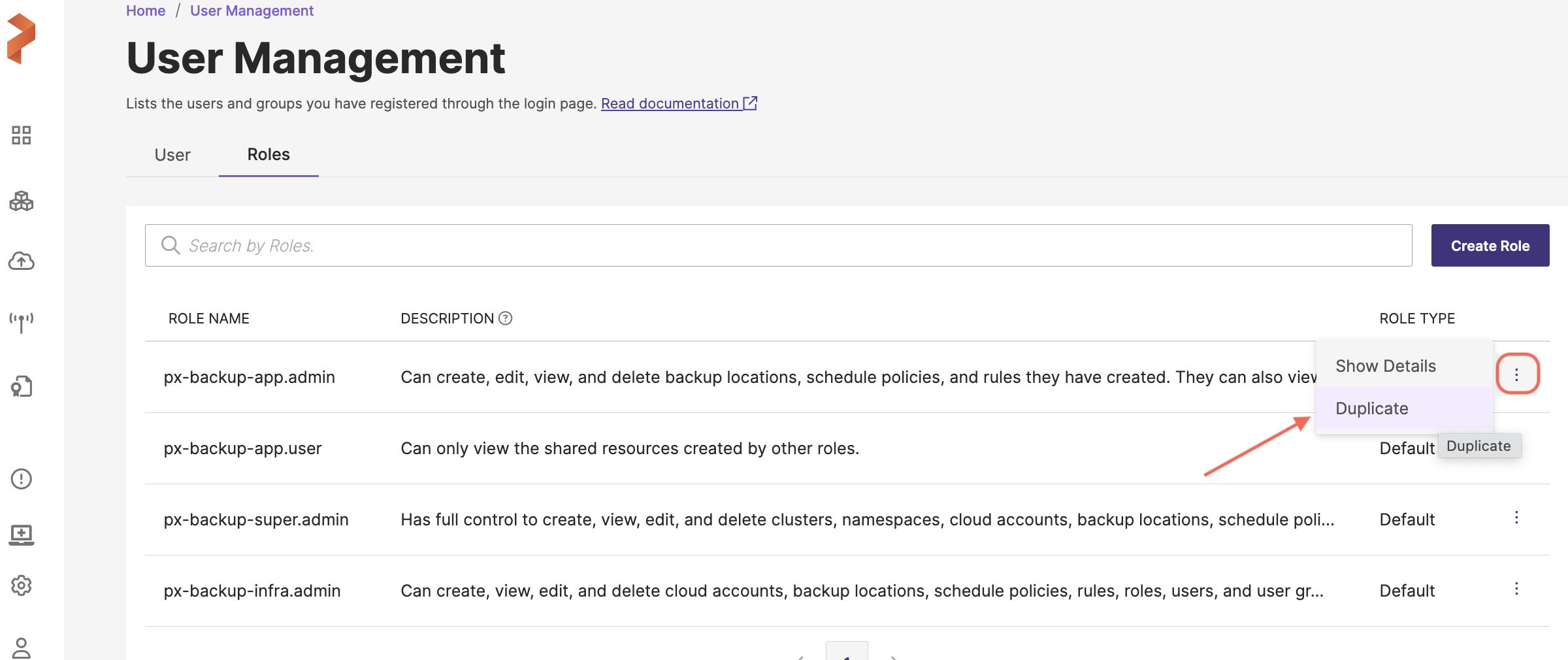 Portworx Backup allows you to duplicate an existing role. Duplicating roles saves you time when creating multiple roles with similar permissions.