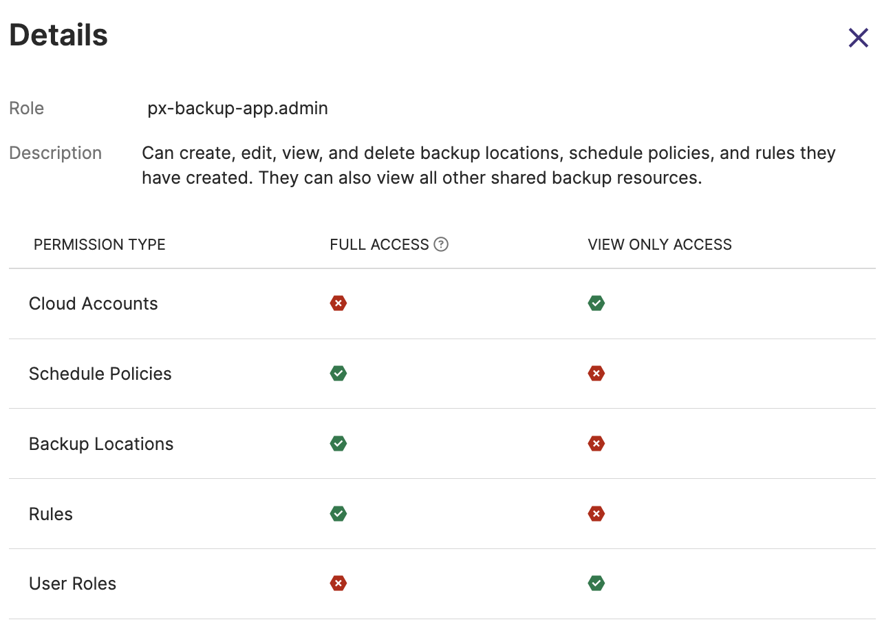 You can add a role with default permissions or assign specific permissions to a role to access Portworx Backup resources. By default, Portworx Backup displays the following pre-created rules: