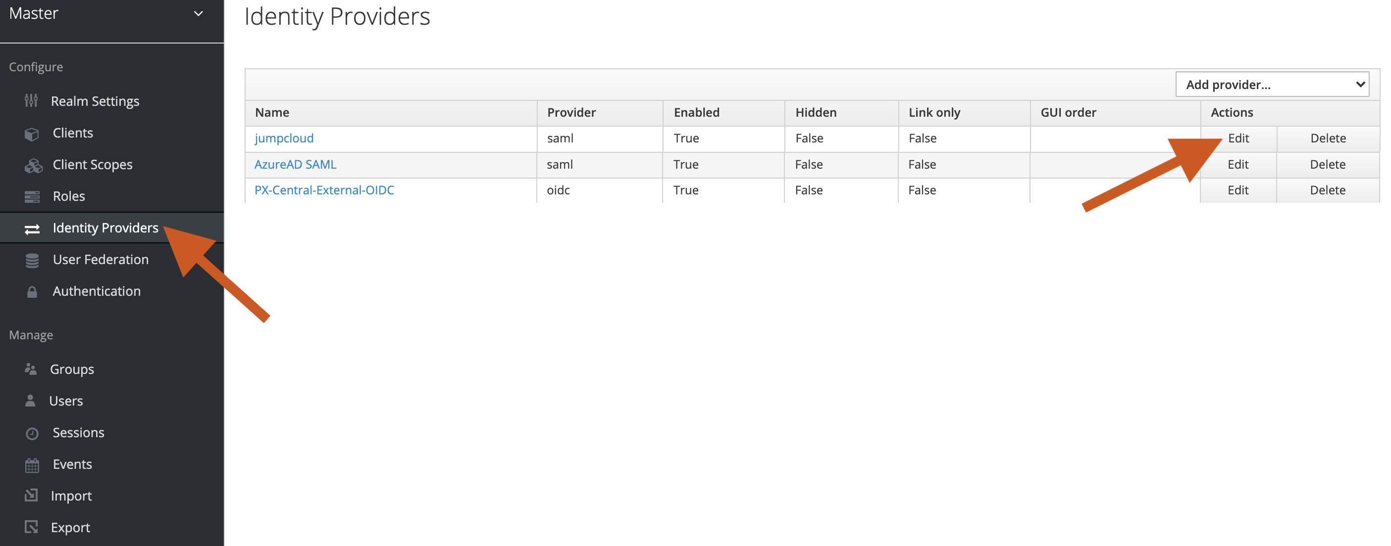 Select Identity Providers from the left pane, and from the list, select Edit on an Identity Provider.