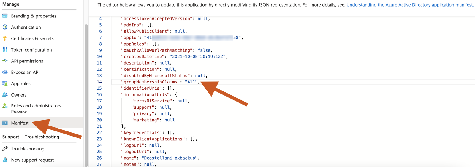 In the pxbackup application page, select Manifest from the left pane. Modify the