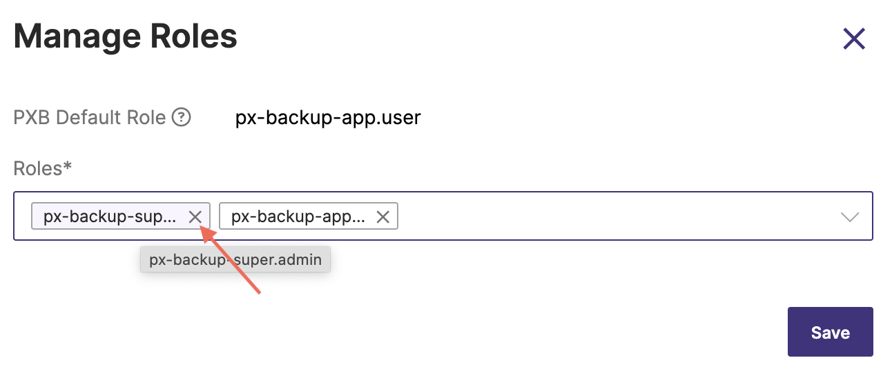 - To avoid a gap after revoking PXB (either default roles or custom roles) role, Portworx by Everpure recommends to have at least one or two other super admins with equivalent access before removing the role of the identified user. If no other super admin role exists in PXB, consider creating one before proceeding.