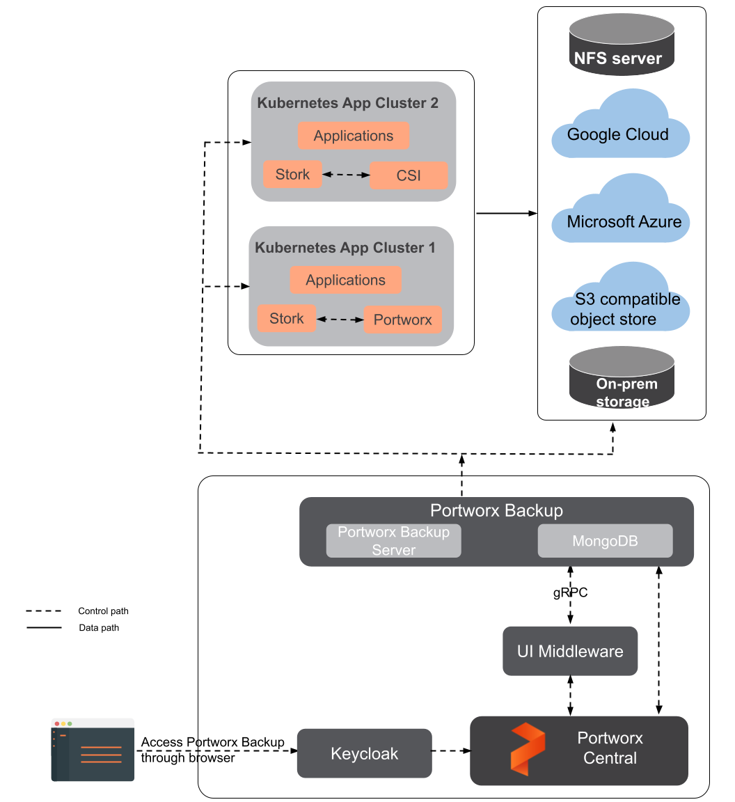 Keycloak Portworx Backup Server communicates with an external OIDC service (Okta, Keycloak, Active Directory, Auth0, and so on) to validate and authorize tokens that are used for the API calls. Keycloak component is installed as part of the Portworx Central deployment. Portworx does not support use of an external Keycloak component, but the internally managed Keycloak component can be configured to add compatible external OIDC providers either during installation or post-installation.