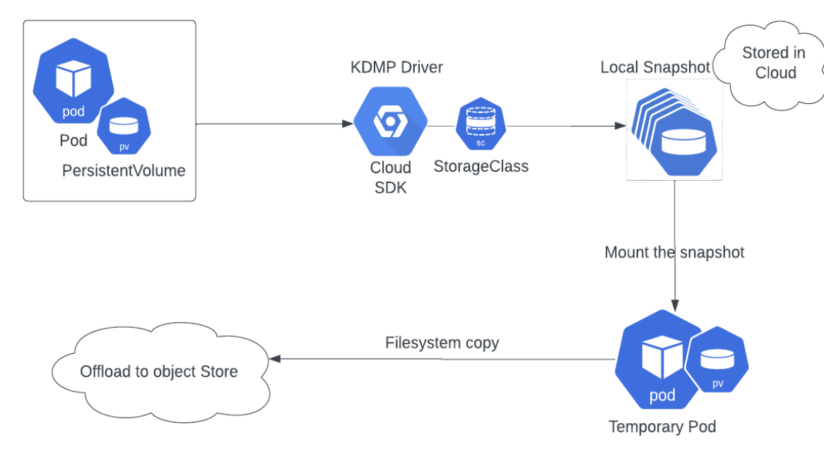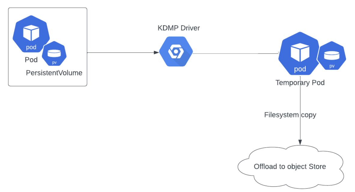 This process uses KDMP driver to attach the mount point of the PV on the worker nodes and copies the file system contents to object storage.