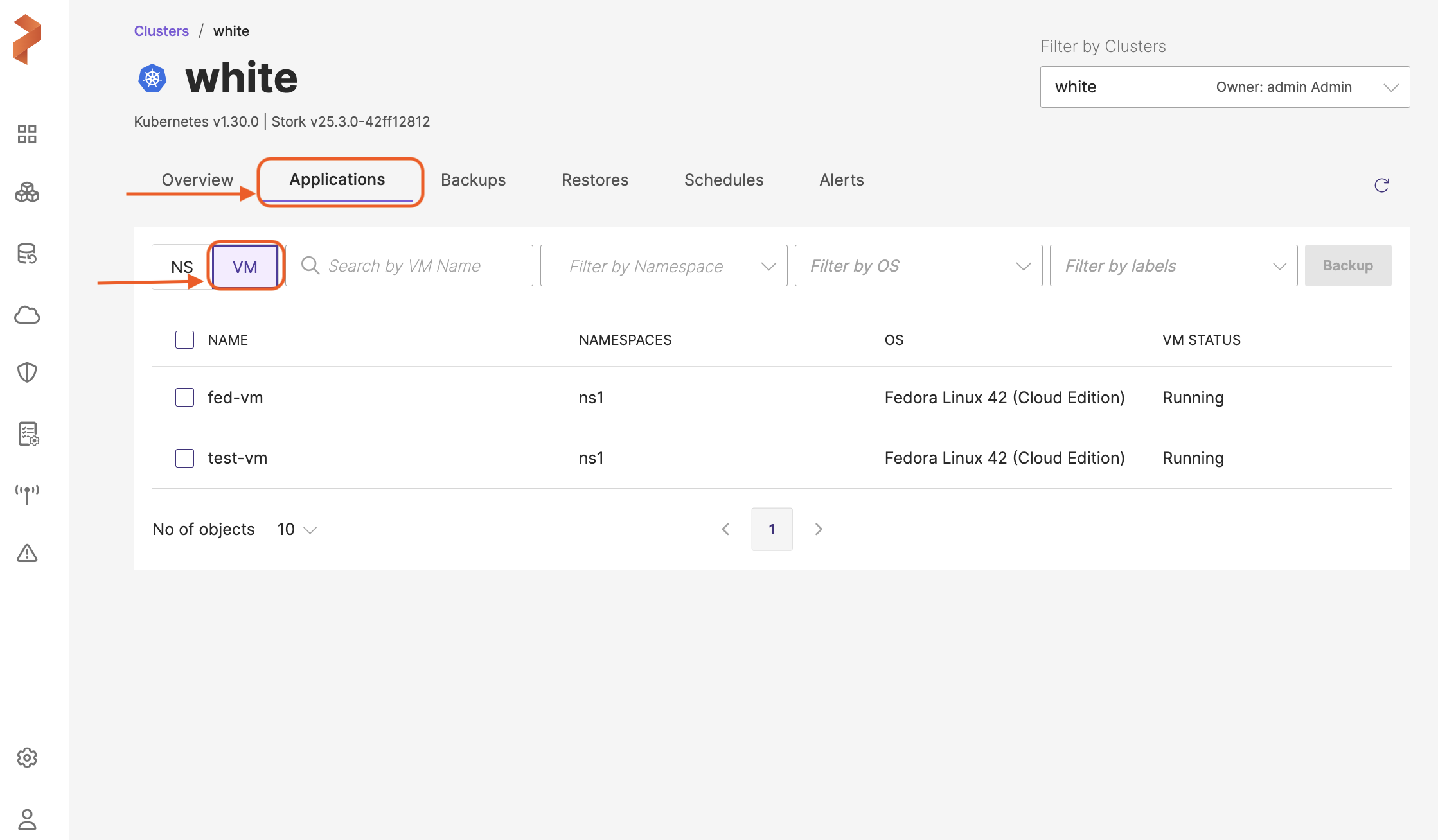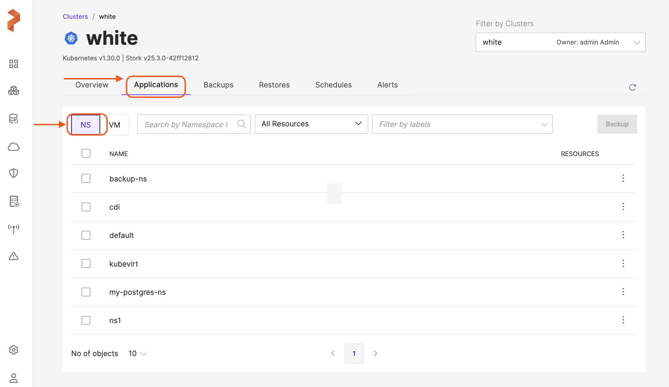 The Applications tab displays the list of Kubernetes Namespaces (NS) and Virtual Machines (VM) for the selected cluster. Users can browse, filter, and select namespaces or Virtual machines to initiate backups.