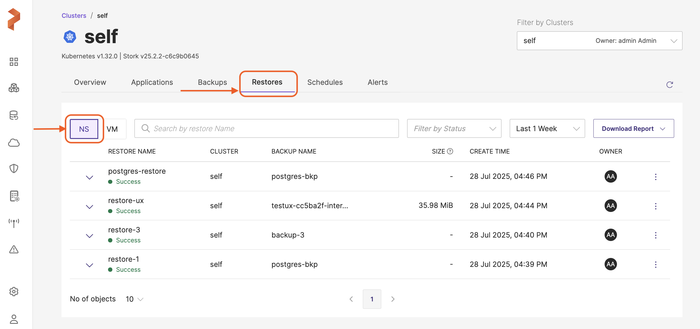 CLUSTER: cluster that holds the namespaces or VMs in the backup you want to restore. You can sort this column either by ascending or descending order of cluster name by clicking on the arrows at the end of the column name. When the data is not sorted, web console always displays the latest record first.