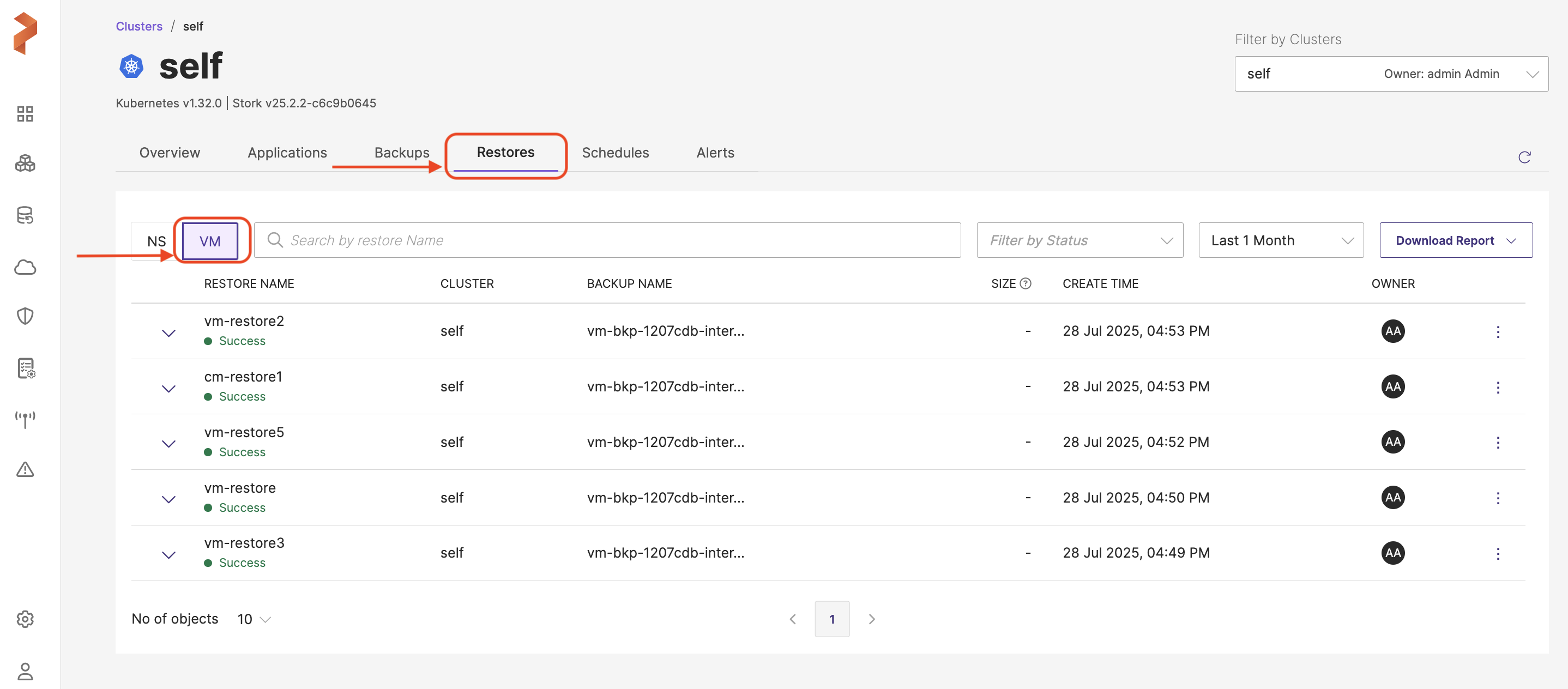 VM (Virtual Machines): allows you to switch to virtual machine-based view and lists out the restores of the VM-based backups