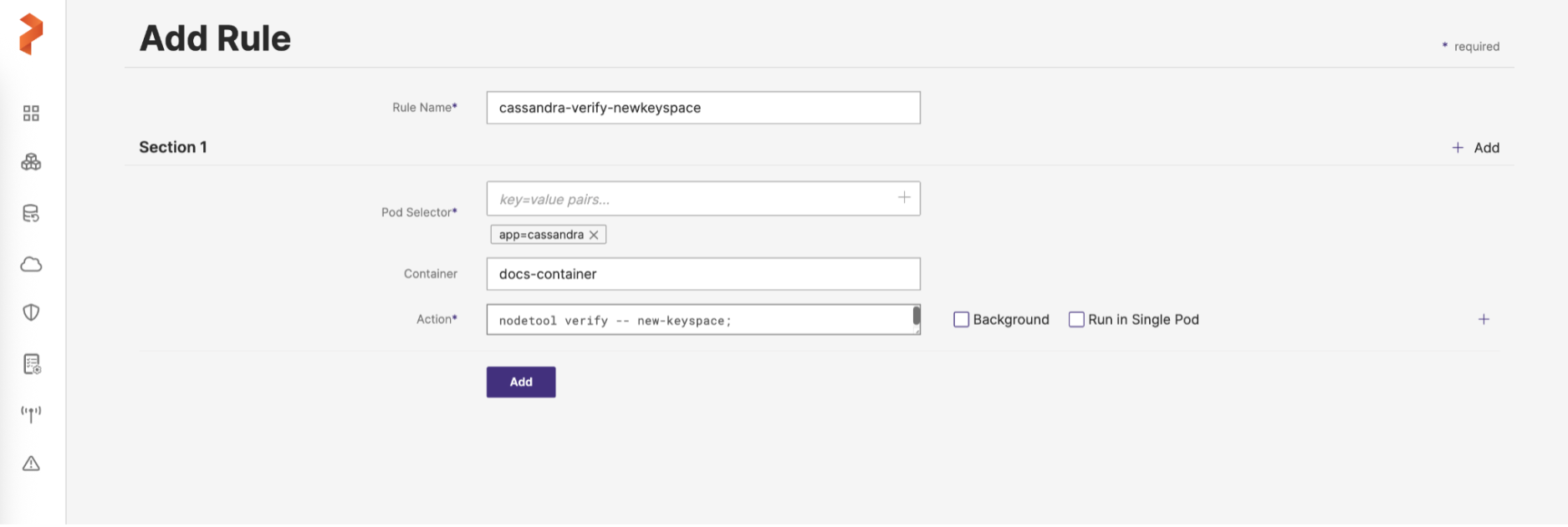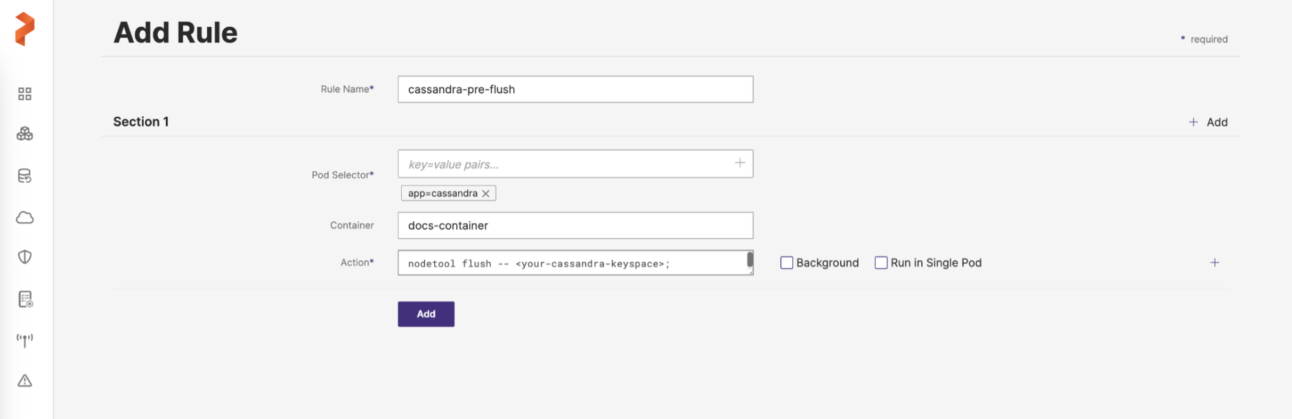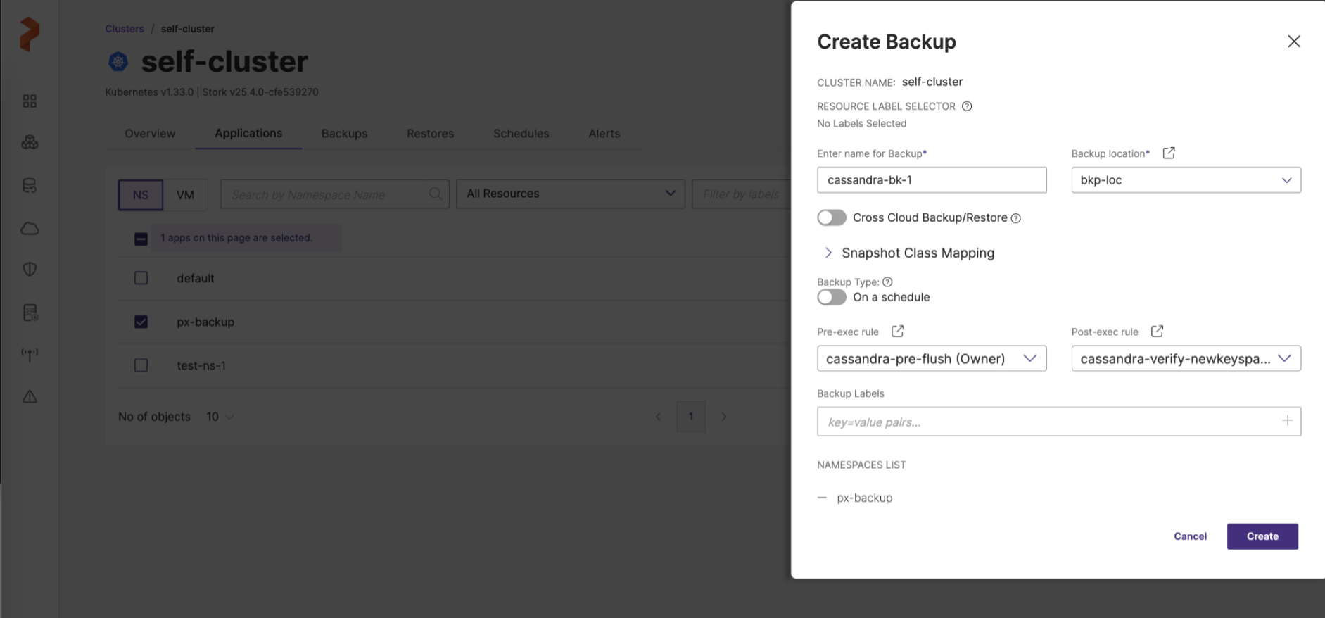 Portworx Backup allows you to set up pre and post backup rules that are applied before and or after a backup occurs. For Cassandra, you can create a custom flush, compaction, or verify rule to ensure a healthy and consistent dataset before and after a backup occurs. Rules can run on one or all pods associated with Cassandra, which is a requirement for nodetool commands.