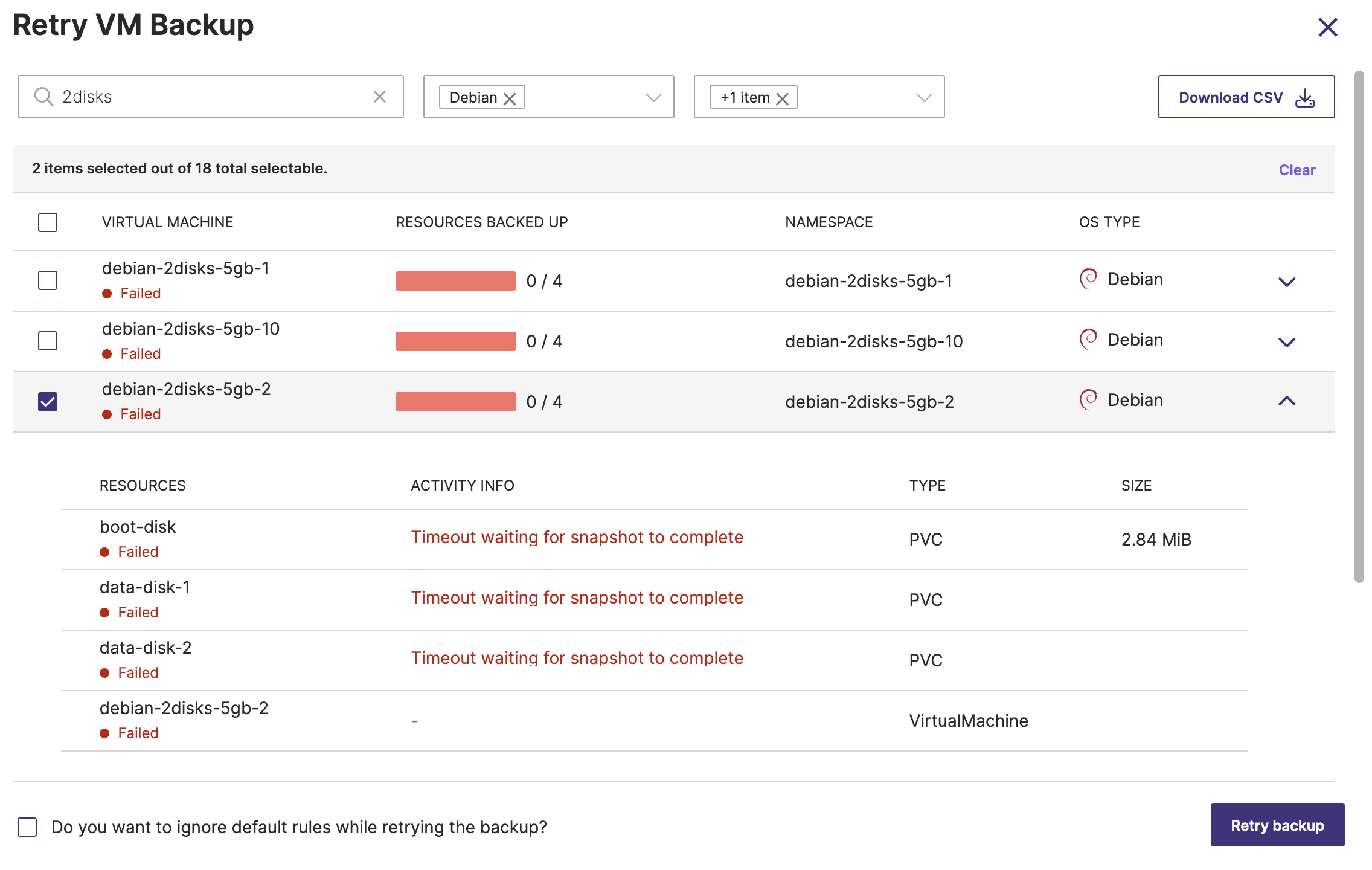 Download CSV: download a detailed CSV report on the failed VMs.