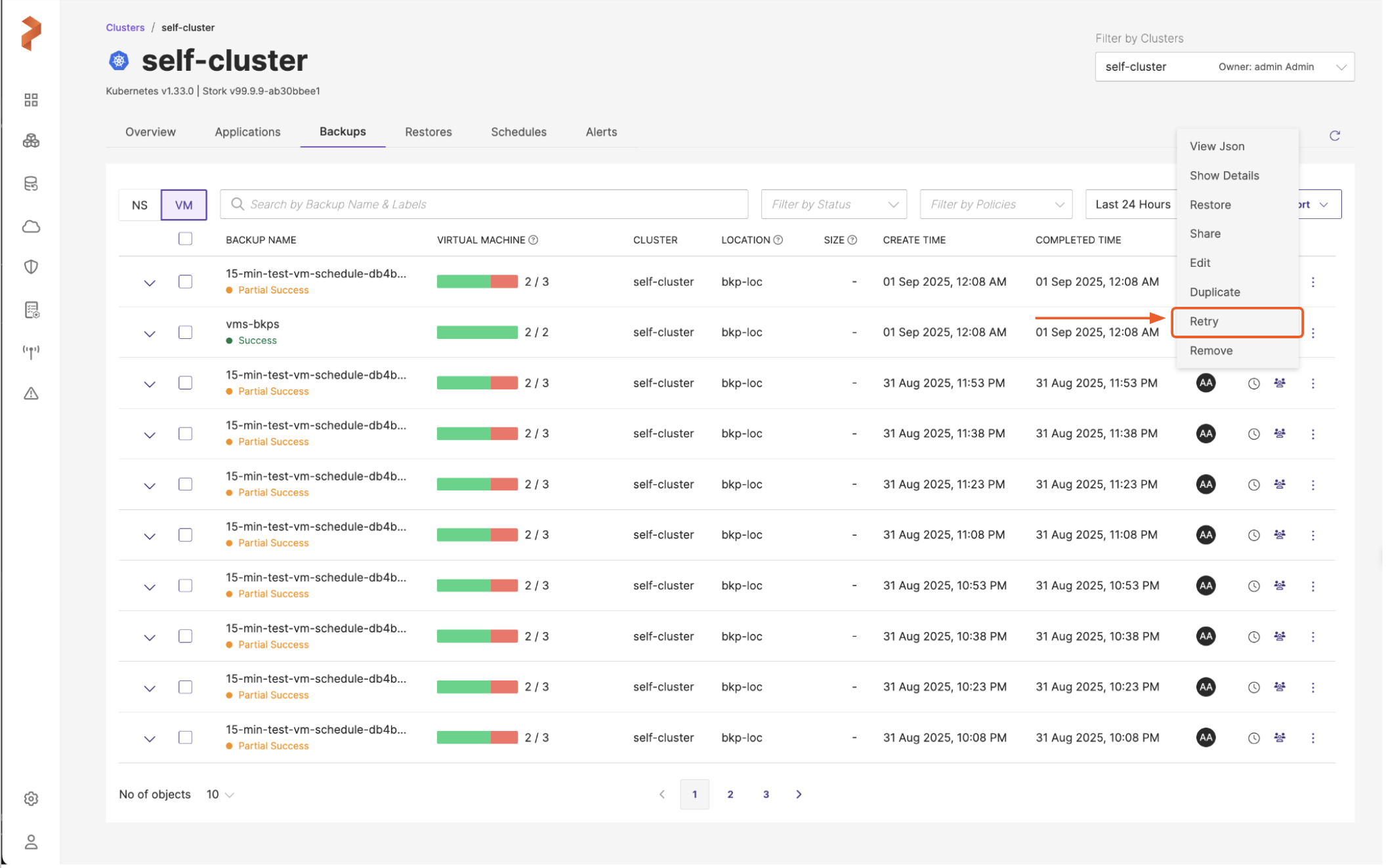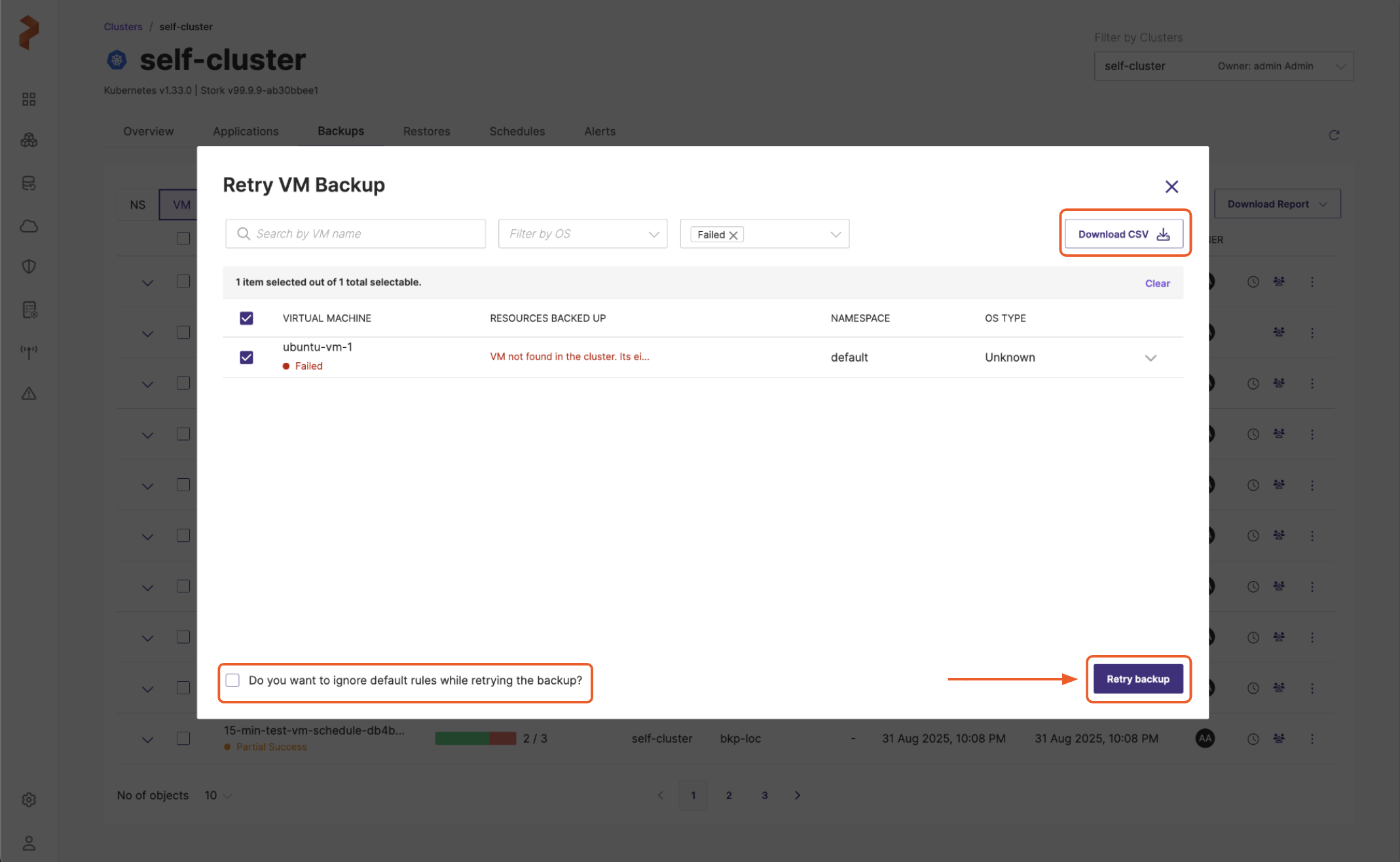 Portworx Backup enables you to retry partial success or failed VM backups with greater precision. This feature enables users to reattempt backup operations specifically for VMs that failed in a prior backup attempt, avoiding duplicate backup of successfully backed-up VMs. For instance, if a backup operation includes multiple VMs and only some fail to be backed up, the retry feature ensures that only the failed VMs are backed up again, instead of reprocessing the entire VM set. This allows for more efficient resource usage and provides finer control over VM backup operations, significantly reducing the time involved.