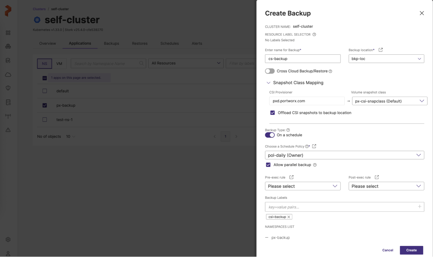- Portworx: creates a Portworx cloud snapshot regardless of Offload CSI snapshots to backup location option is selected or not