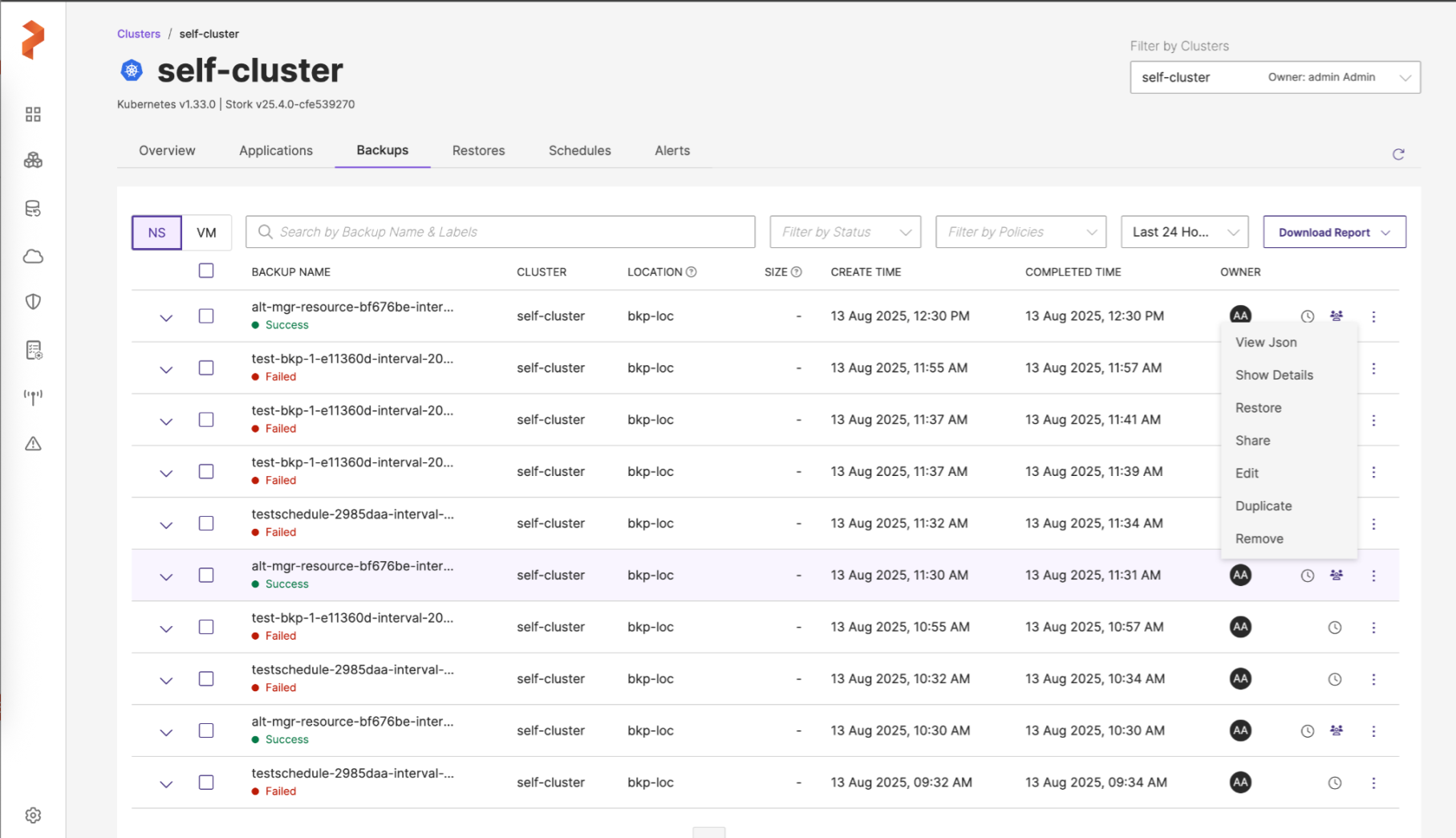 In the Clusters page, choose the application cluster where your backup resides.