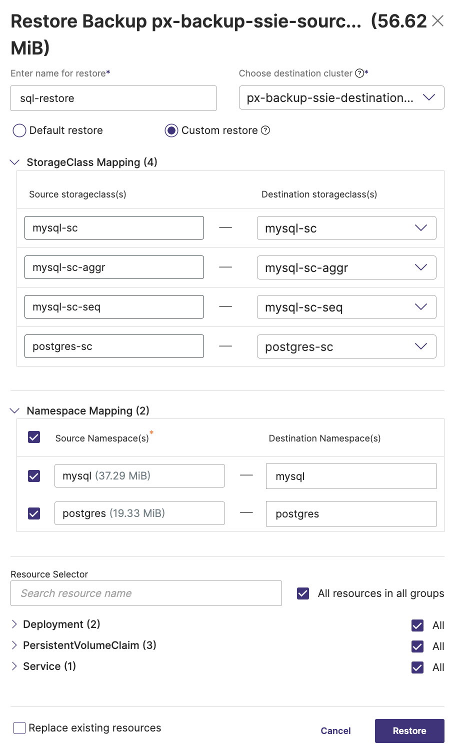 Storageclass mapping: the source and destination remain the same, Portworx Backup expects that the destination storageclass already exists.