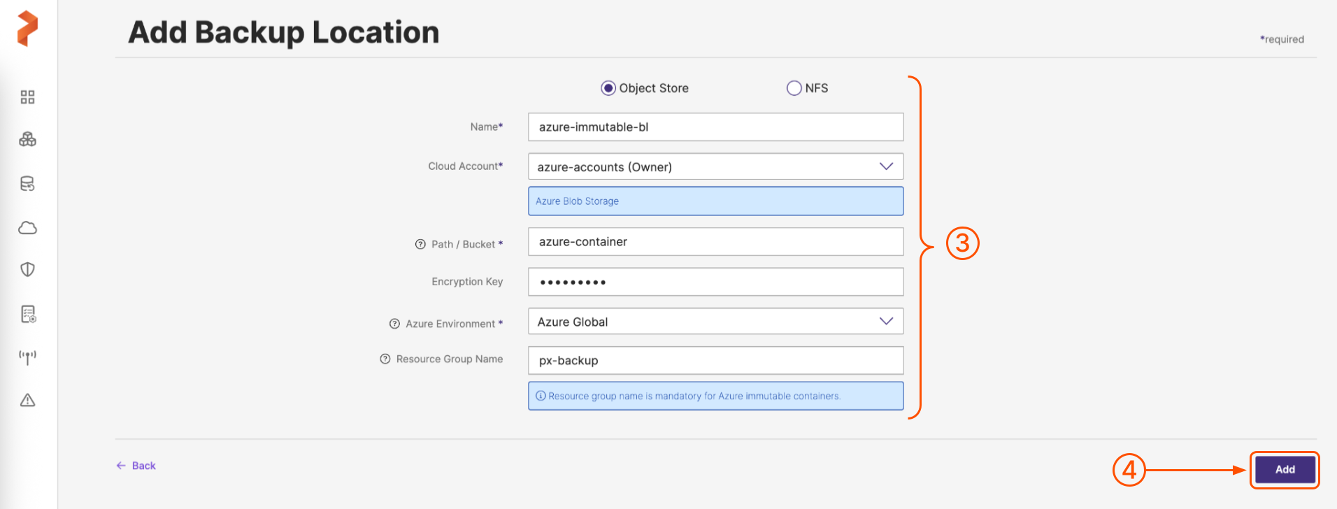 Immutability support helps to protect data from overwrites and deletes. Starting from Portworx Backup version 2.7.3, you can add your containers (that support immutability) as a backup location through the Portworx Backup web console. You will need new Azure credentials and configurations to add immutable Azure backup locations.