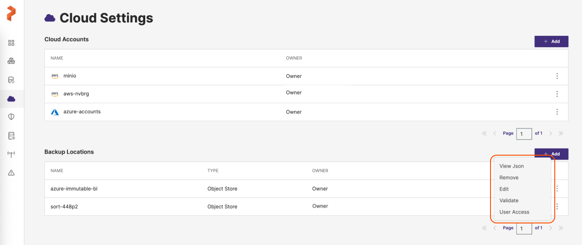 - Edit: allows you to change the cloud account associated with the backup location
