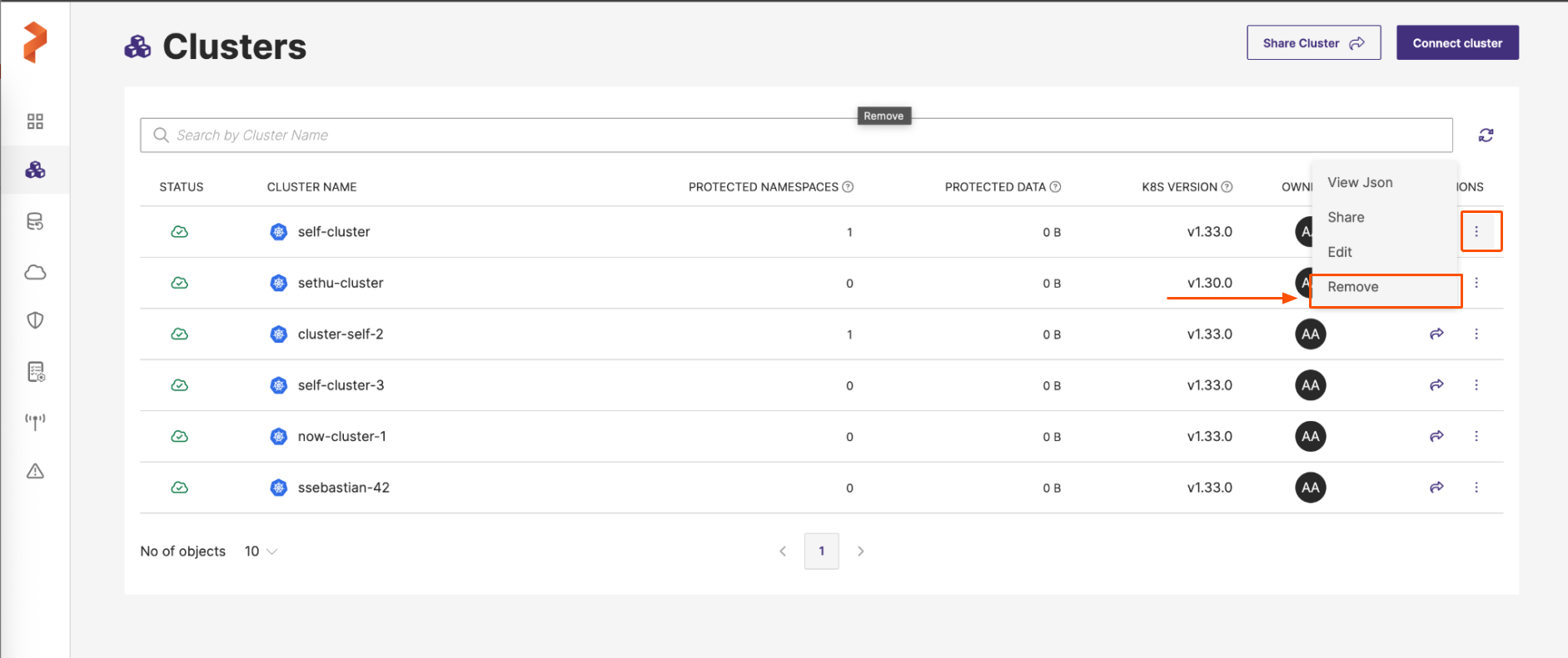 In case you want to delete multiple backups in a page, select the required backups, move the cursor towards the Vertical ellipsis next to any backup entry and choose Remove.