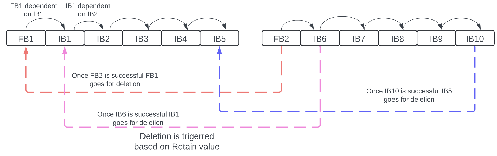 After FB2 (Full backup 2) is successfully created, FB1 is marked for deletion, and after IB6 (Incremental backup 6) is successful, IB1 can be deleted. After IB10 is successful, IB5 is also marked for deletion, with the strategy to retain the most recent backups and deleting the older ones.