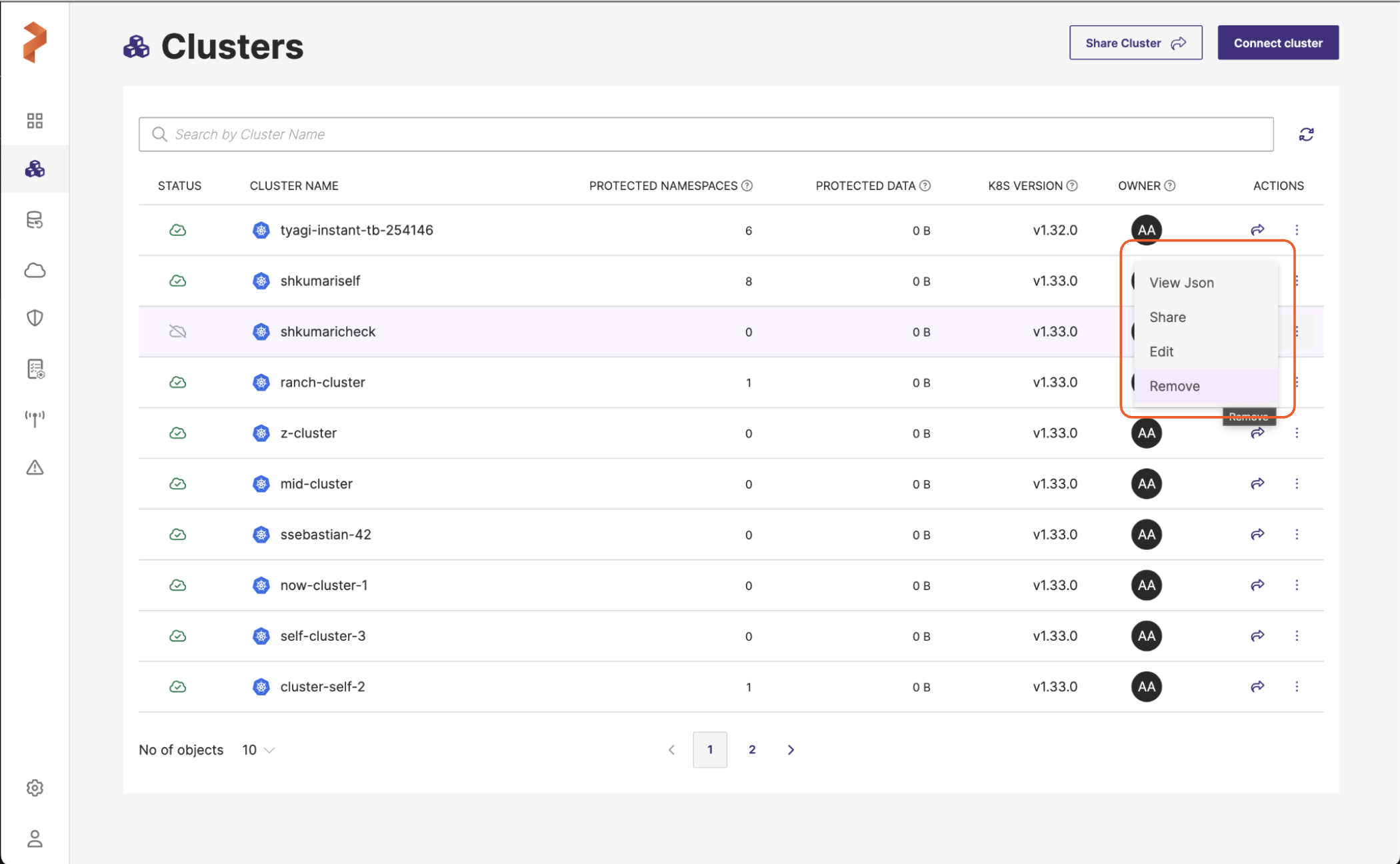 Click Vertical ellipsis at the end of the selected cluster row and then select Remove to delete the required cluster: