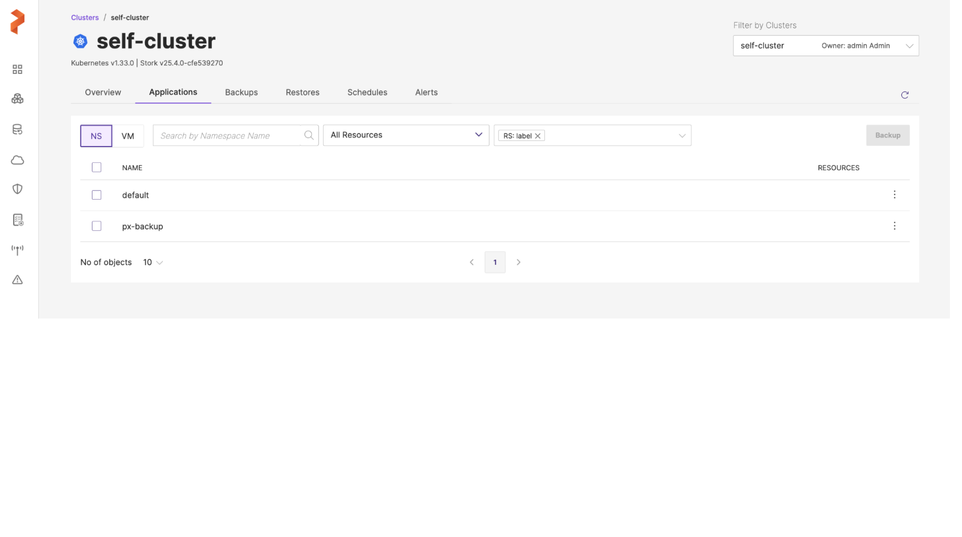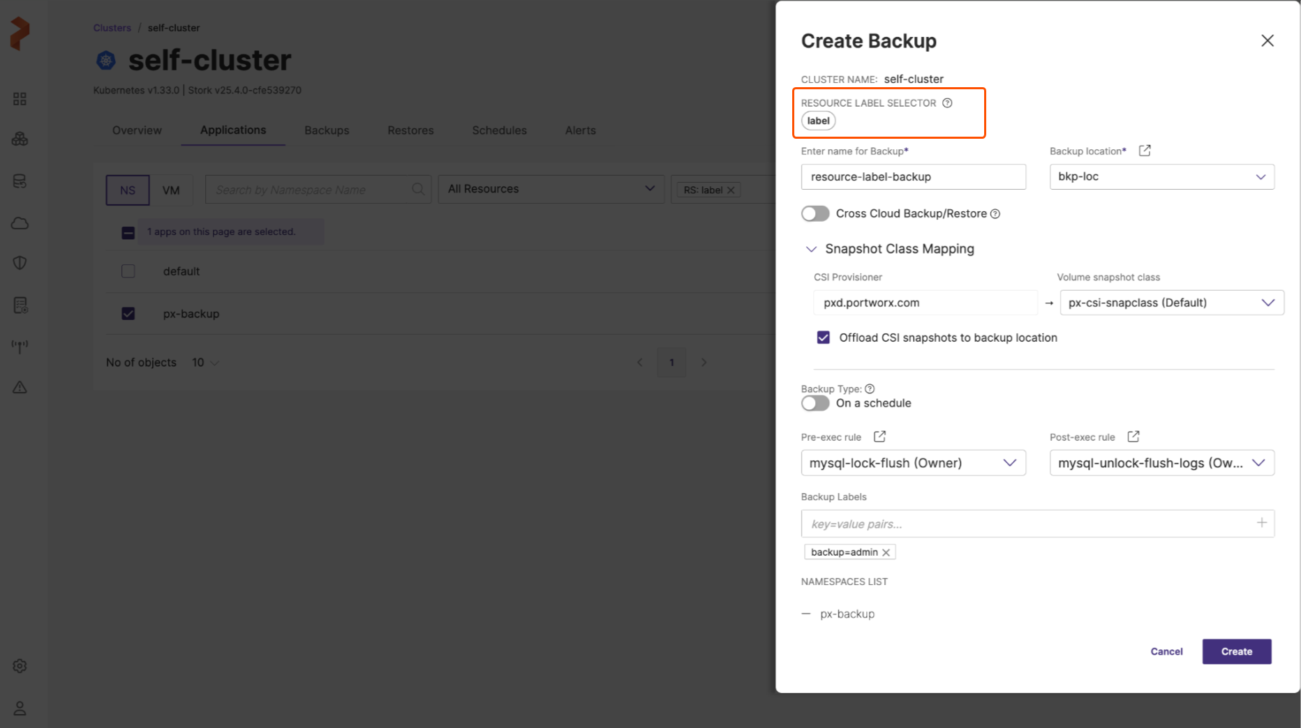 Kubernetes allows you to selectively apply required labels to the resources of a namespace with a key-value format using the CLI. Portworx Backup UI enables you to filter those labeled resources with the label and then take a backup of all such resources of the selected namespace.