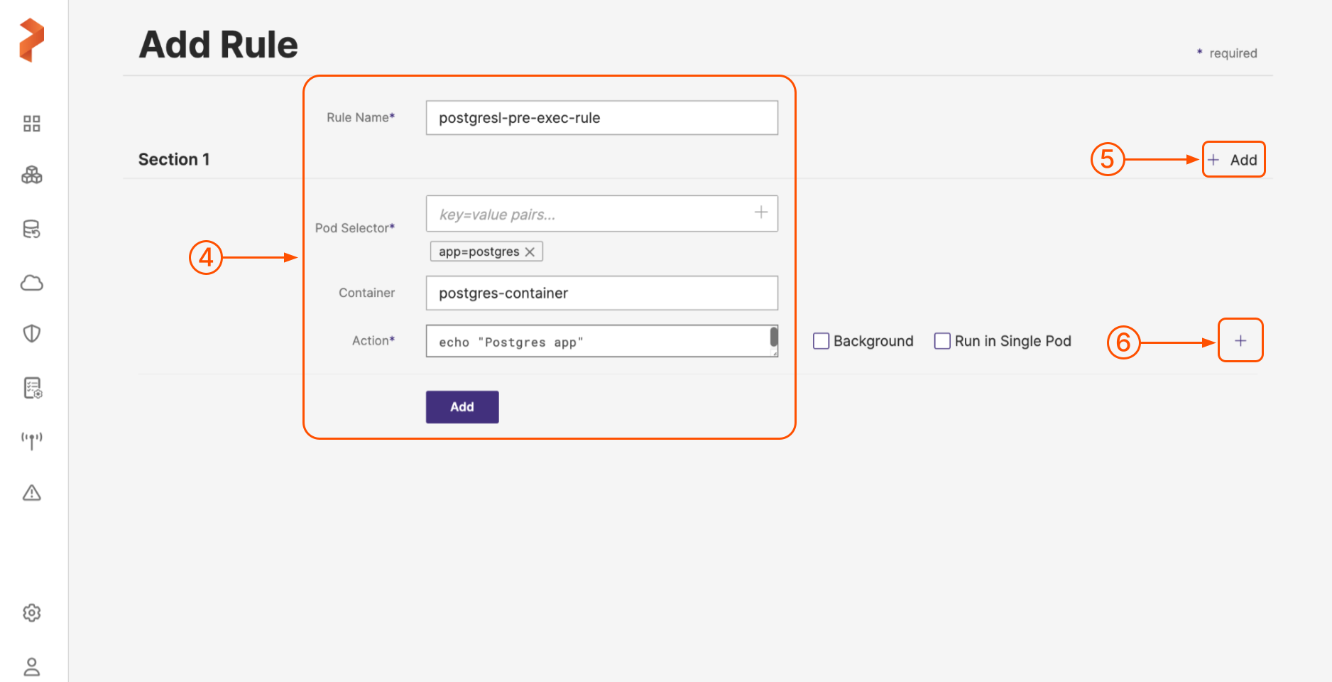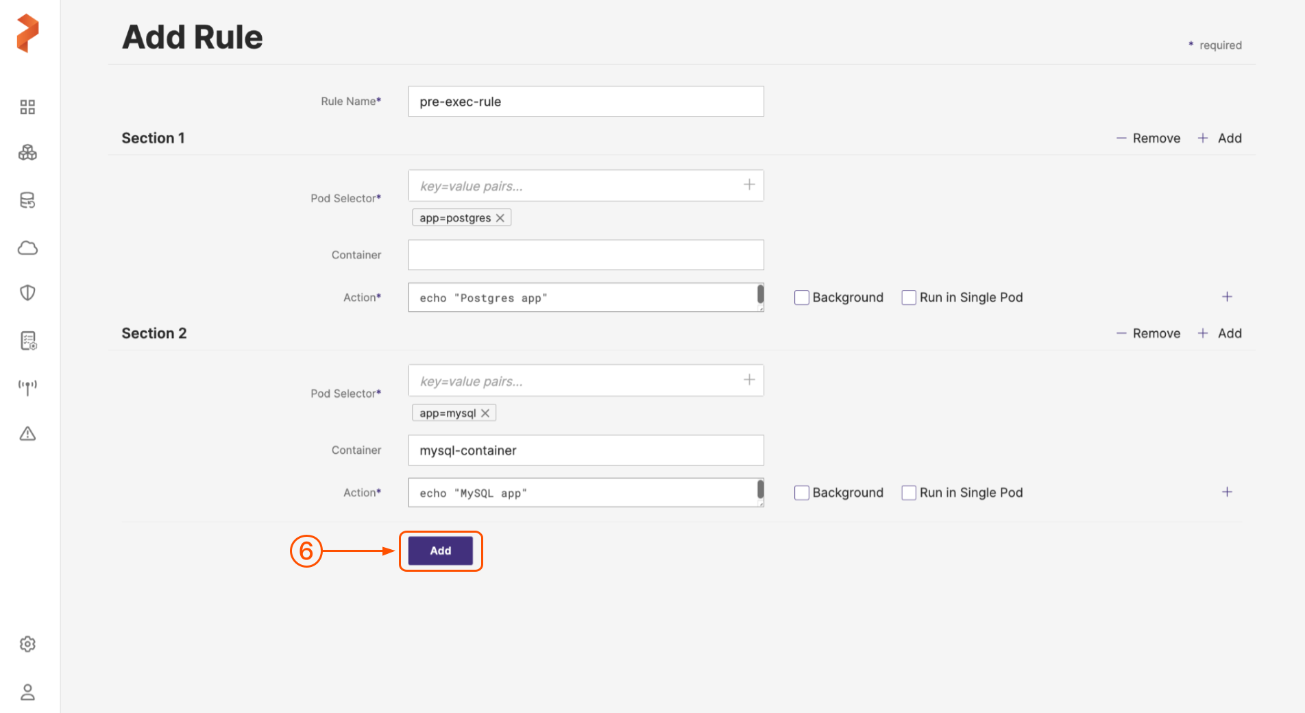 (Optional): Select the + Add icon to add more sub-rules if you have more than one container for the chosen application (Pod selector) or you have to apply rules for more than one application in one go.