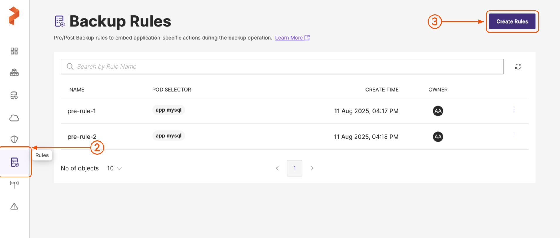 Once you have created this pre-exec rule, the rule gets listed in the Backup Rules page. You can later associate this rule with a backup. The pre-exec rule gets applied before creation of backup.