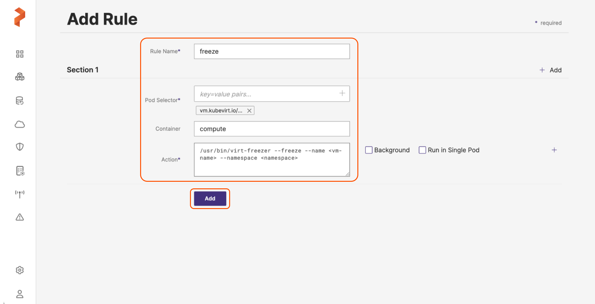 If you want to take file-system consistent backups, here are the sample values for pod selector and action field to create pre-exec and post-exec rules. Freeze/thaw rules execute virt-freezer within the virt-launcher pod.