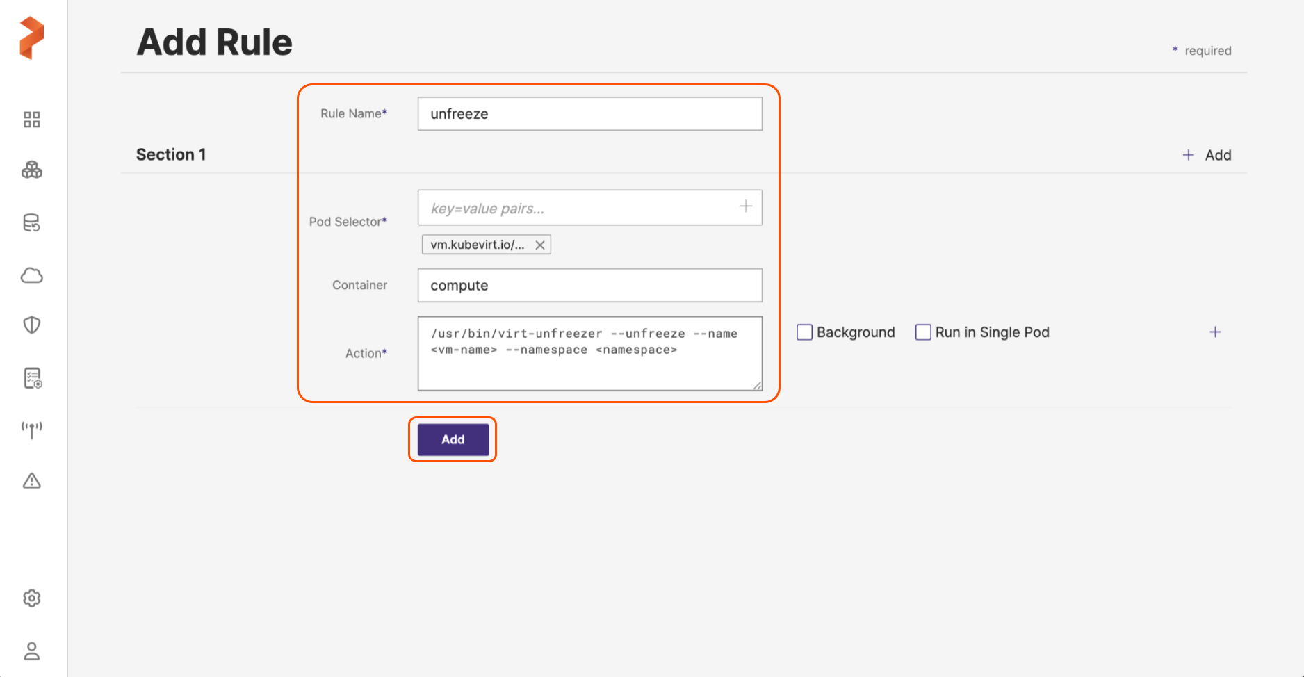 Here is a sample value for Pod Selector and Action fields for pre-exec and post-exec rules: