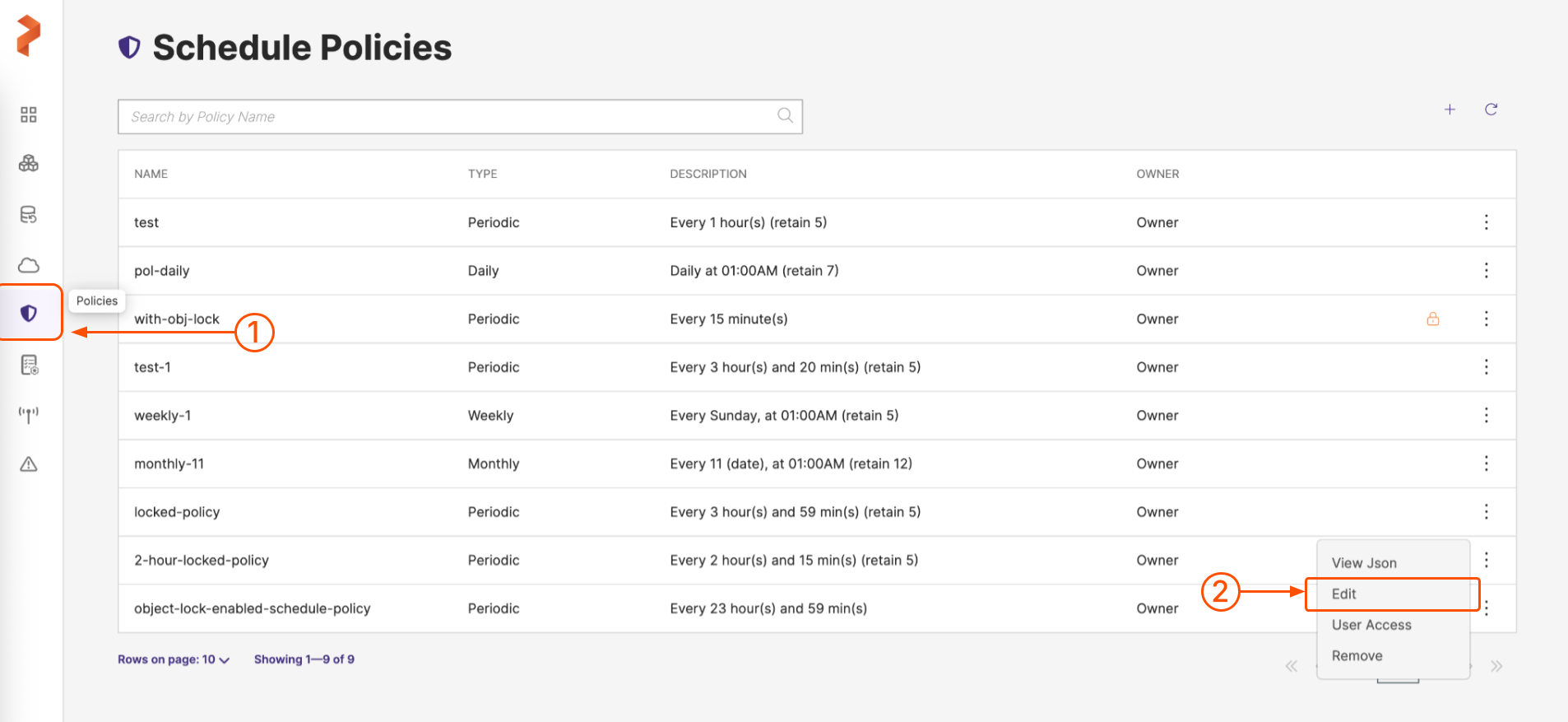 Select Policies from the left navigation pane. Select the vertical ellipsis at the end of the schedule policy you want to update and choose Edit.: