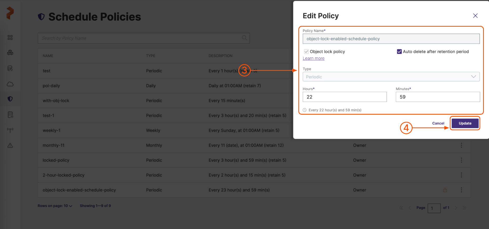 To update an object lock enabled schedule policy: