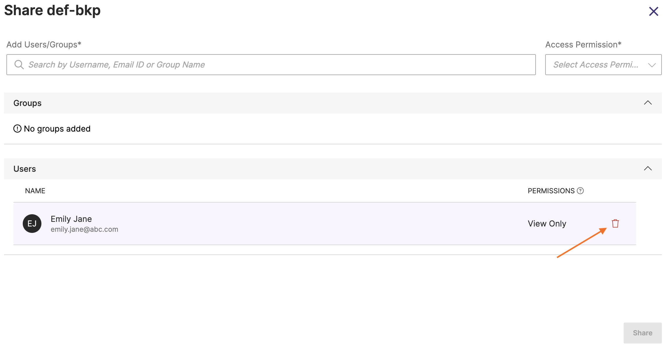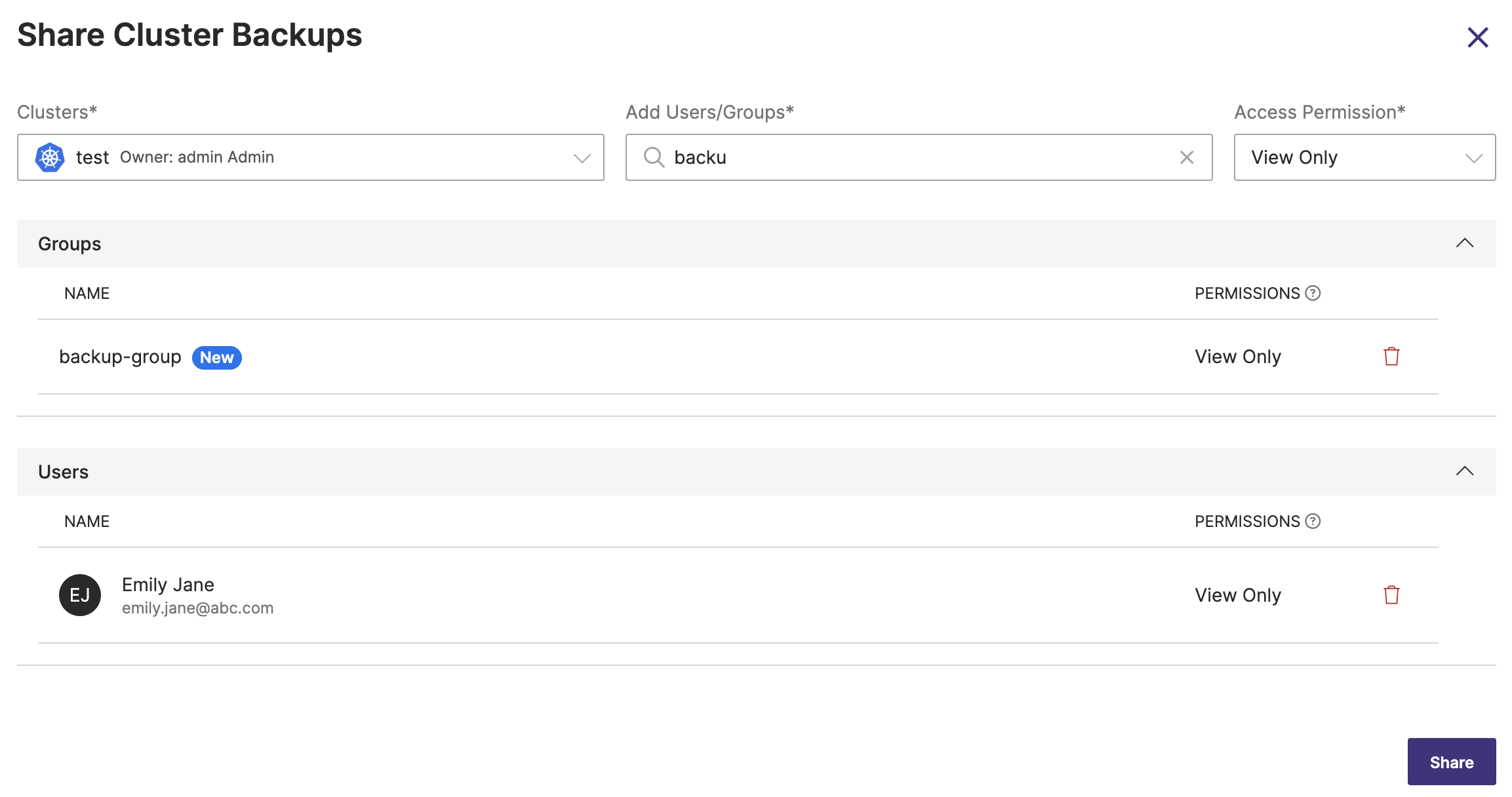 In Share Cluster Backups window, navigate to the required user(s) and/or group(s) and click the delete icon to delete them and then click Share: