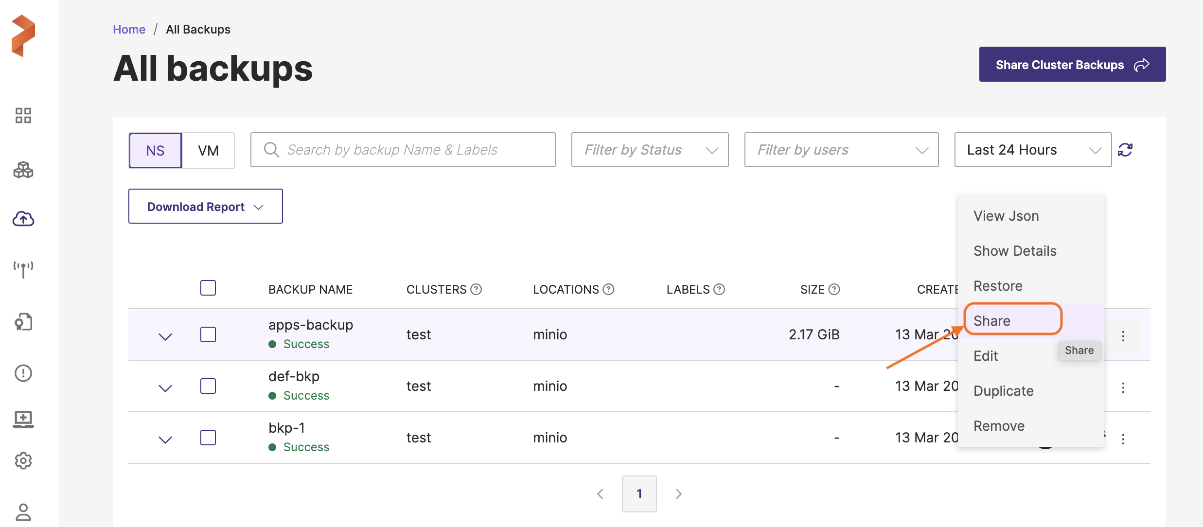 Alternatively you can also share a single backup from the Portworx Backup home page.
