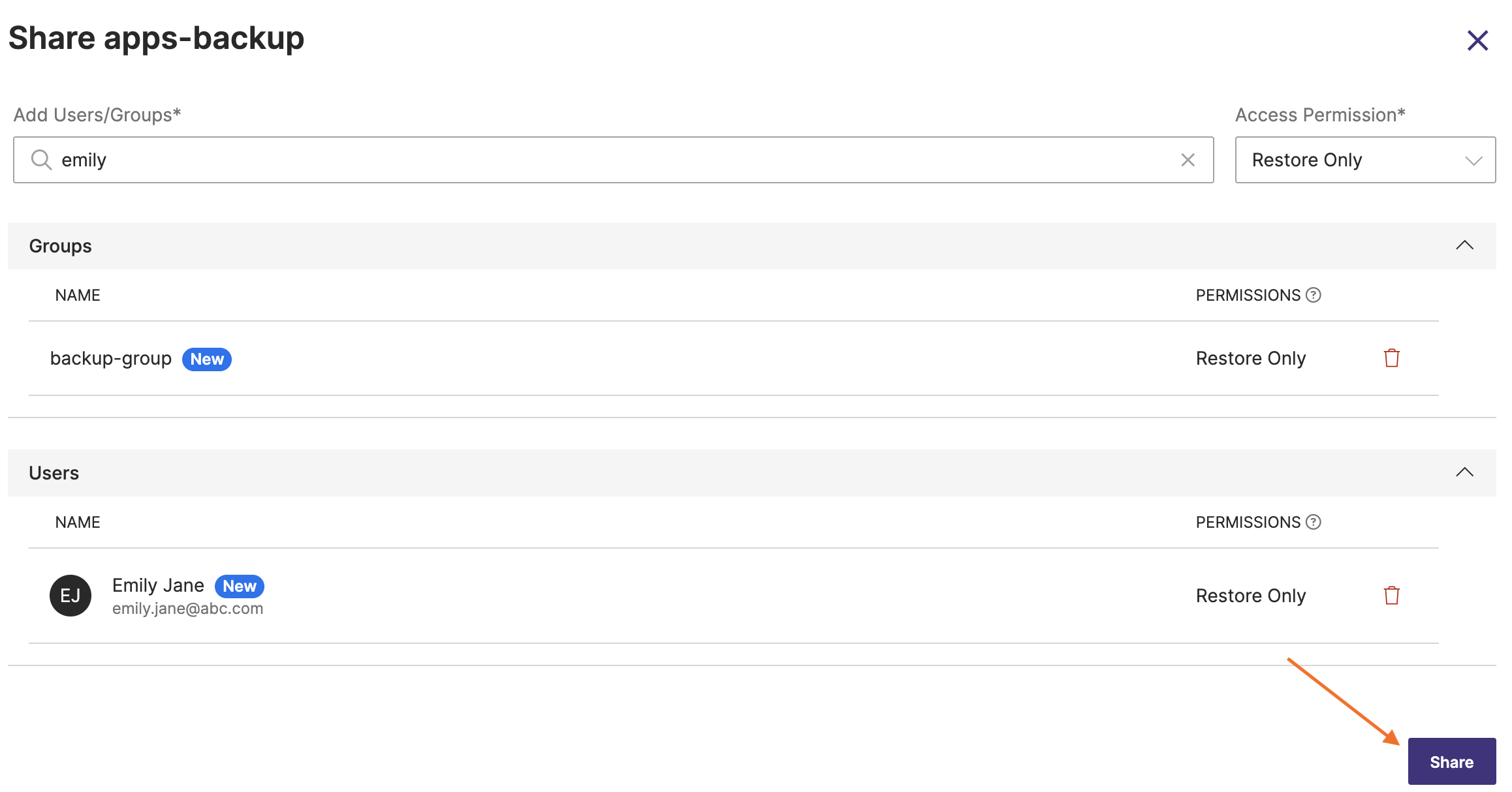 In Share Backup window, enter the name of the user(s) and/or the group(s) with whom you want to share the backups and choose the required type of access. For more information, refer Access types.