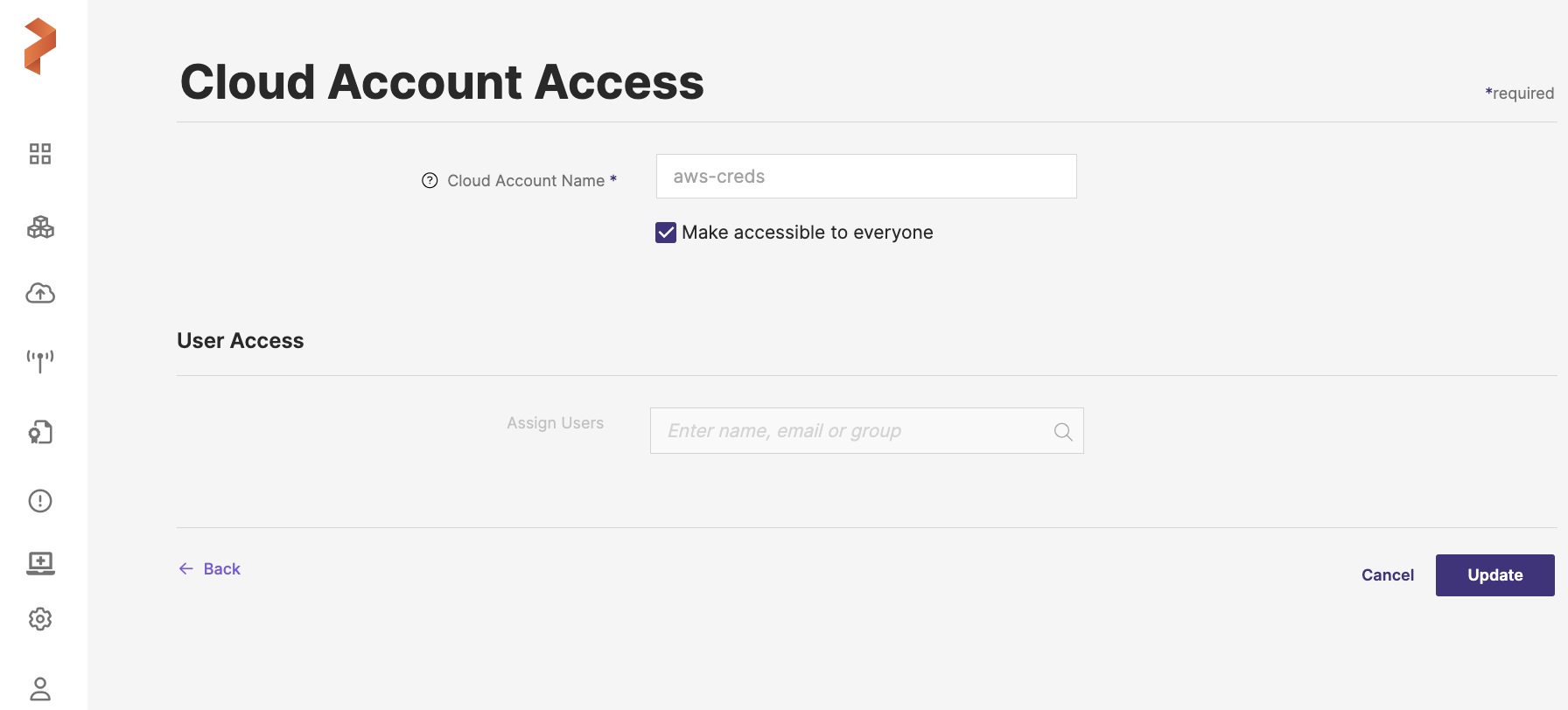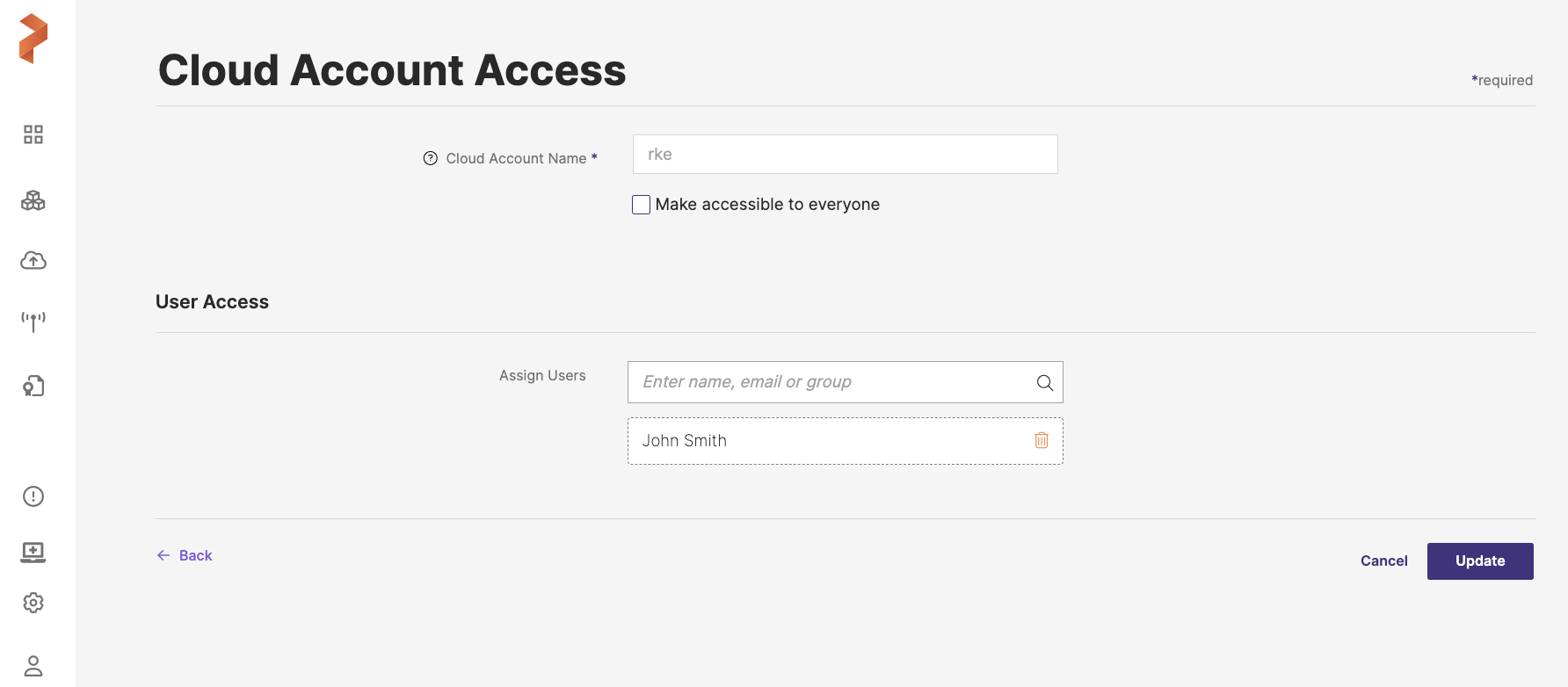 From the Cloud Accounts Access page > User Access section > Assign Users search box, type any character of an existing user or user group name, or email.