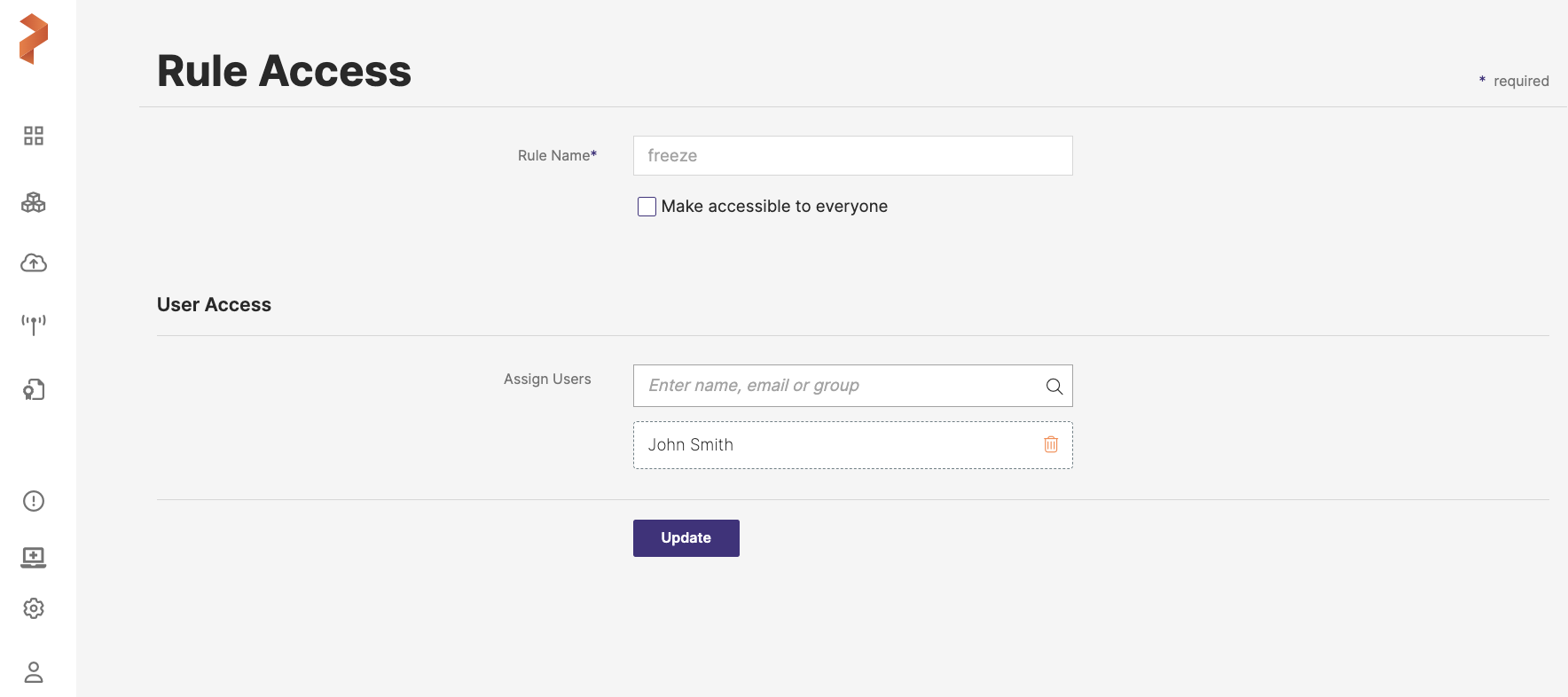 From the home page, navigate to Clusters > Settings > Rules >Rule Access > User Access > Assign Users, type any character of an existing user or user group name, or email.