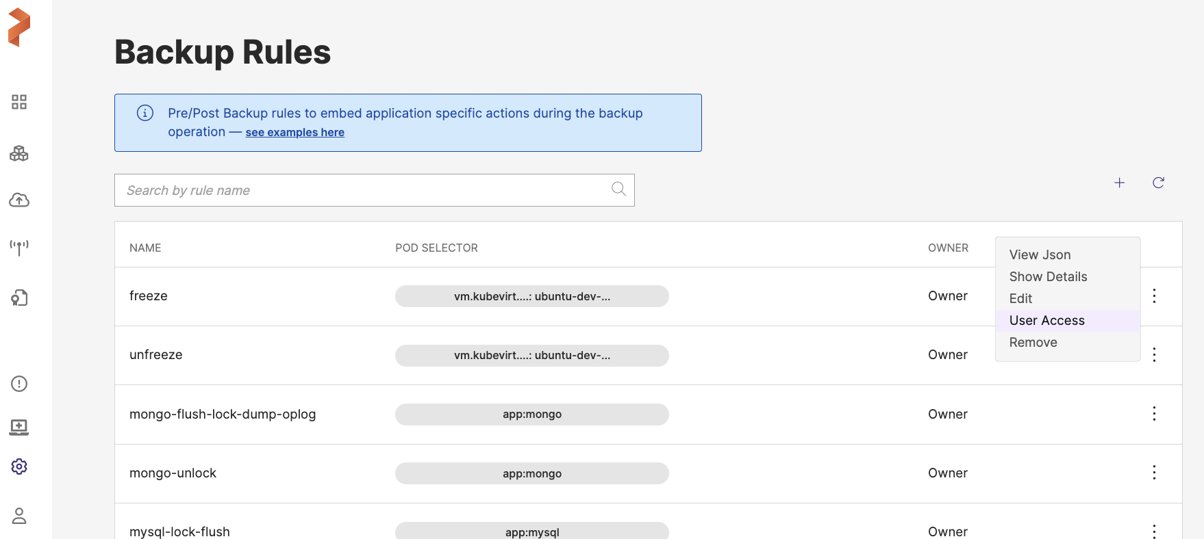 From the Backup Rules page, select the vertical ellipsis on the backup rule you want to share access and select User Access.