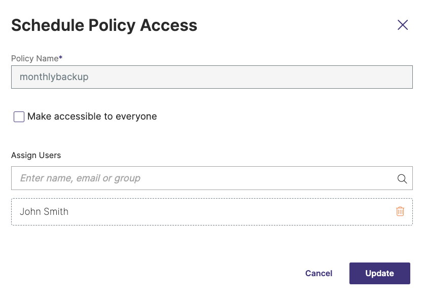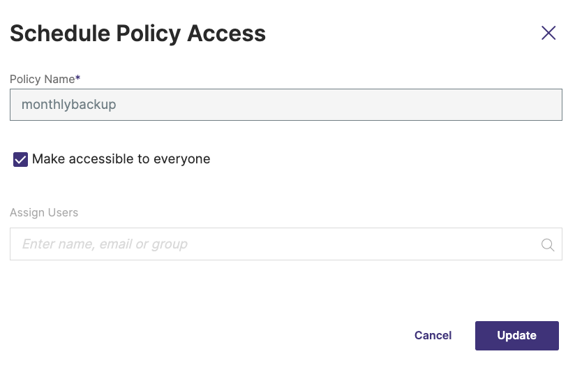 From the Schedule Policy Access window > Assign Users search box, enter any character of a user or user group name, or email.