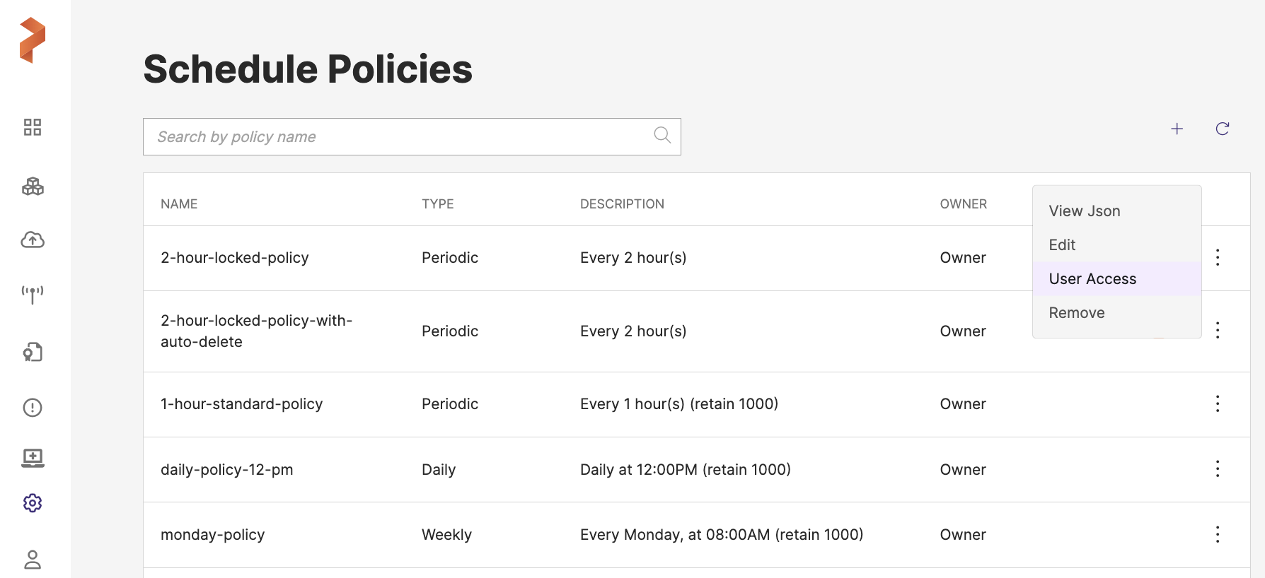 - In the Schedule Policies page, select the vertical ellipsis on the schedule policy you want to share access and select User Access.