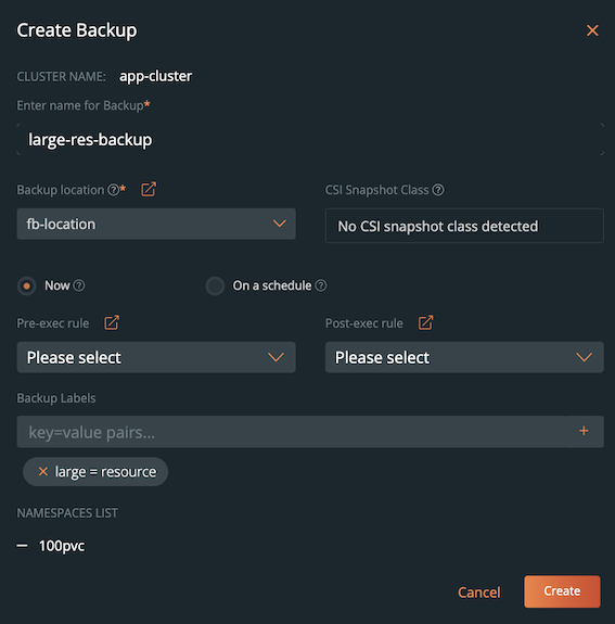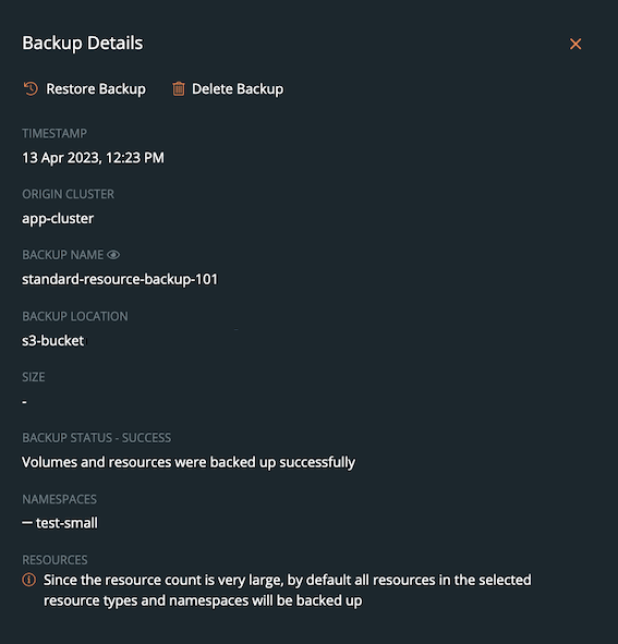 Following this notification message, Portworx Backup successfully creates a backup of namespace(s) with large number of resources. Considering the sheer number of resources tagged to a namespace, the user interface does not display the resource detail in the Backup Details window after creation of backup.