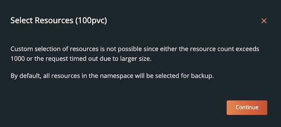 Portworx Backup does not allow custom selection of resources if you want to include them for the backup from the vertical ellipsis and when the resource count exceeds 1000. By default, all the resources in namespaces are selected for the backup. In such a scenario, the user interface displays the following notification message: