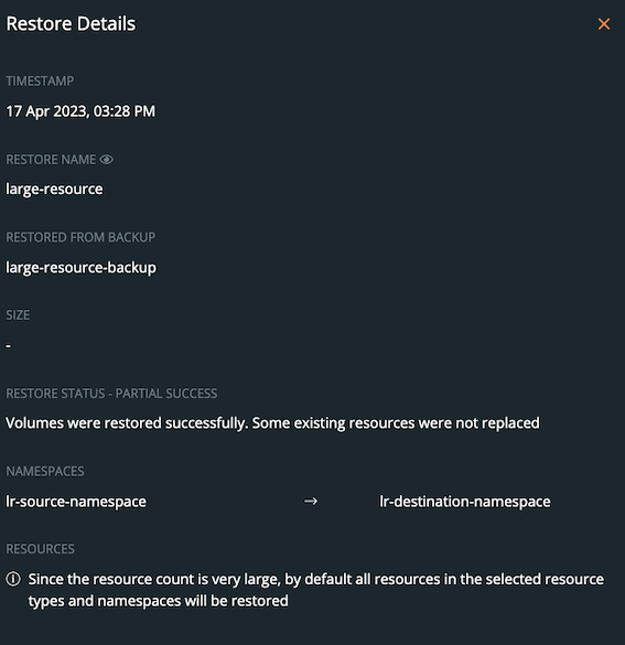 After Portworx Backup successfully completes the restore, you can view the resource details in the Restore Details window through Vertical ellipsis >> Show Details at the end of the restore row. Resource details are not displayed in Restore Details window for large resource restores because of the large resource count.