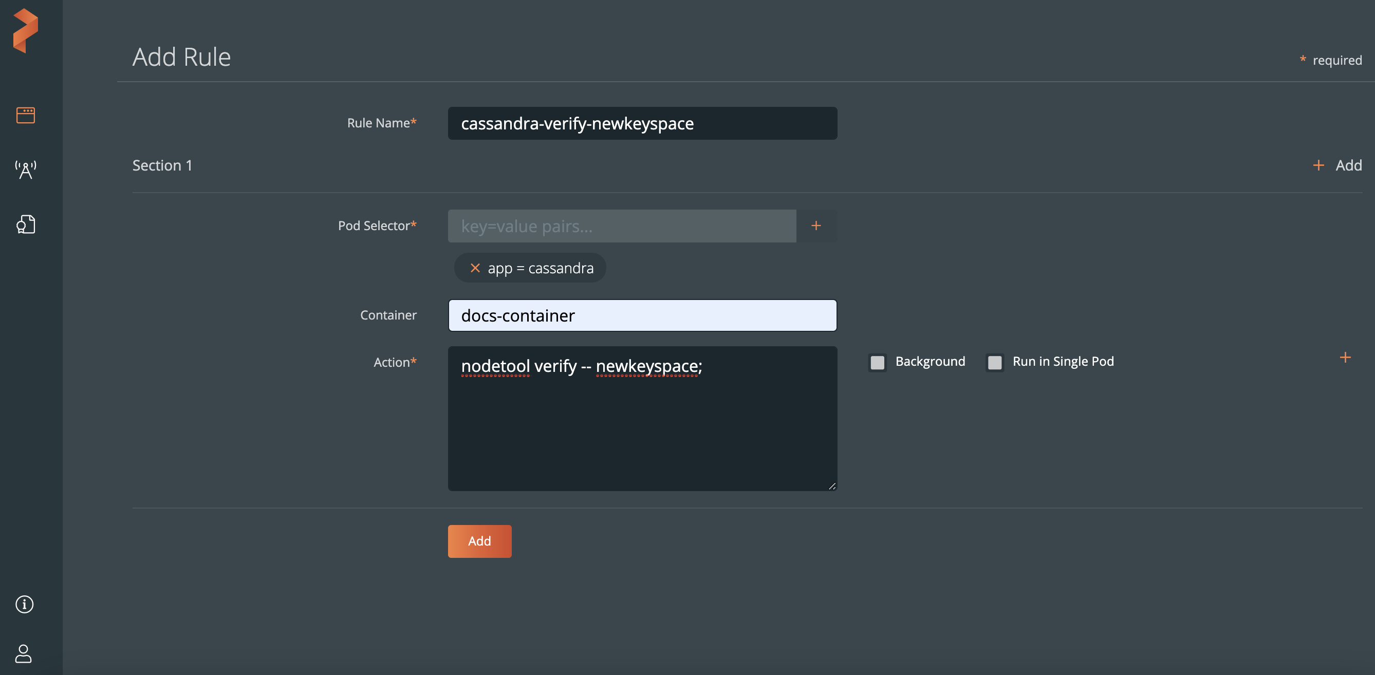 Portworx Backup allows you to set up pre and post backup rules that are applied before and or after a backup occurs. For Cassandra, you can create a custom flush, compaction, or verify rule to ensure a healthy and consistent dataset before and after a backup occurs. Rules can run on one or all pods associated with Cassandra, which is a requirement for nodetool