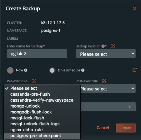 During the backup creation process, select the rules in the pre-exec and post-exec dropdowns:
