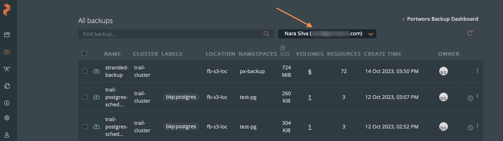 Select the required user(s) and click outside the drop-down. The user interface displays all backups that belong to the selected user(s).