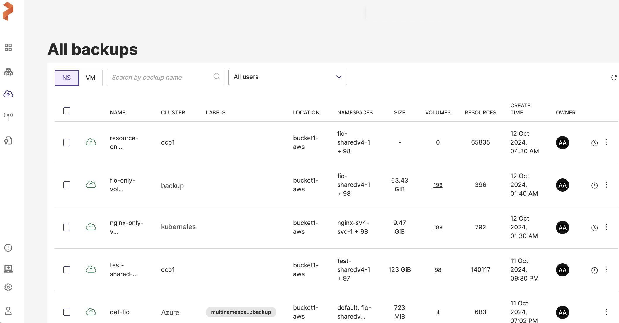 - NS (Namespace): displays namespace-based backups. Namespaces in Kubernetes are logical separations within the cluster, and this view allows users to manage backups of entire namespaces.