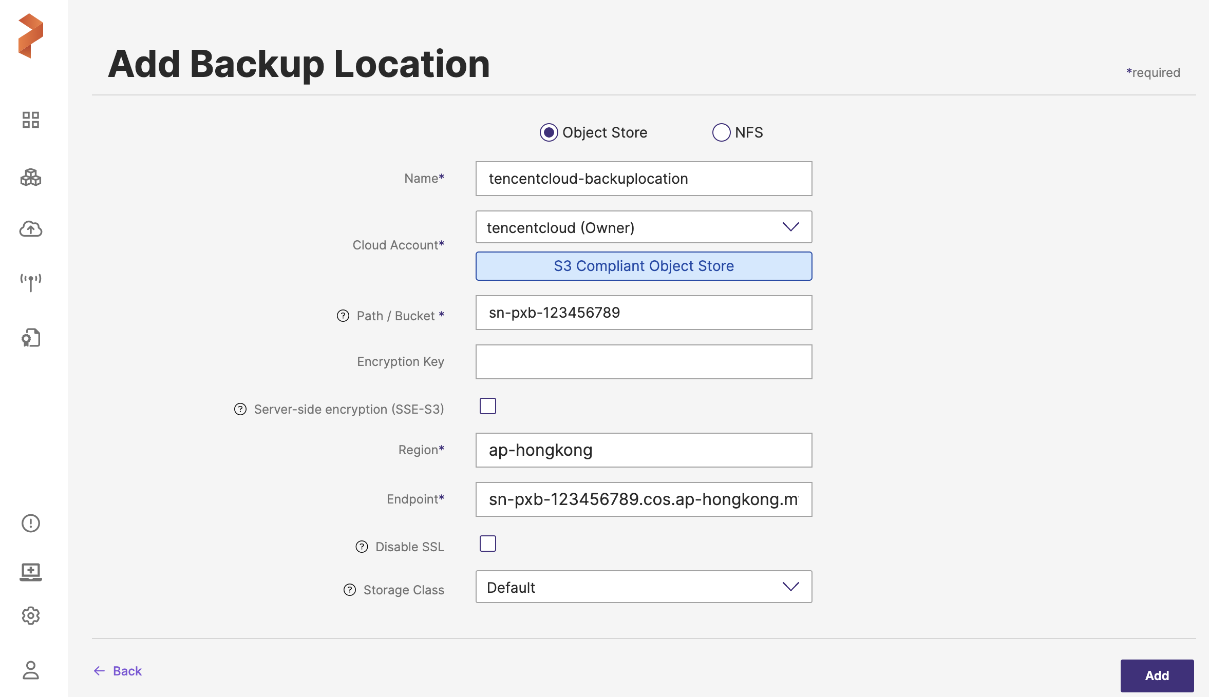 Perform the following steps to add COS bucket as backup location: