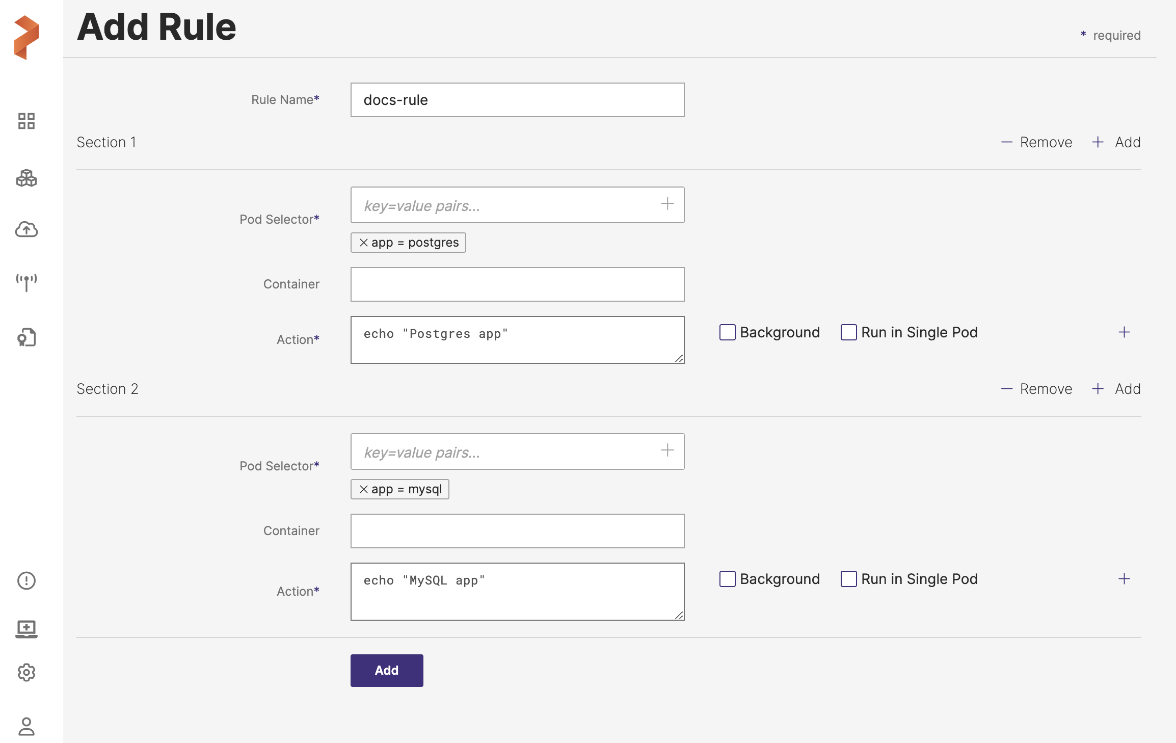 Run in single pod: run this rule in a single pod. Kubernetes scheduler chooses the pod here and can be used to take a backup of your elective lead based applications (for example, mongoDB).