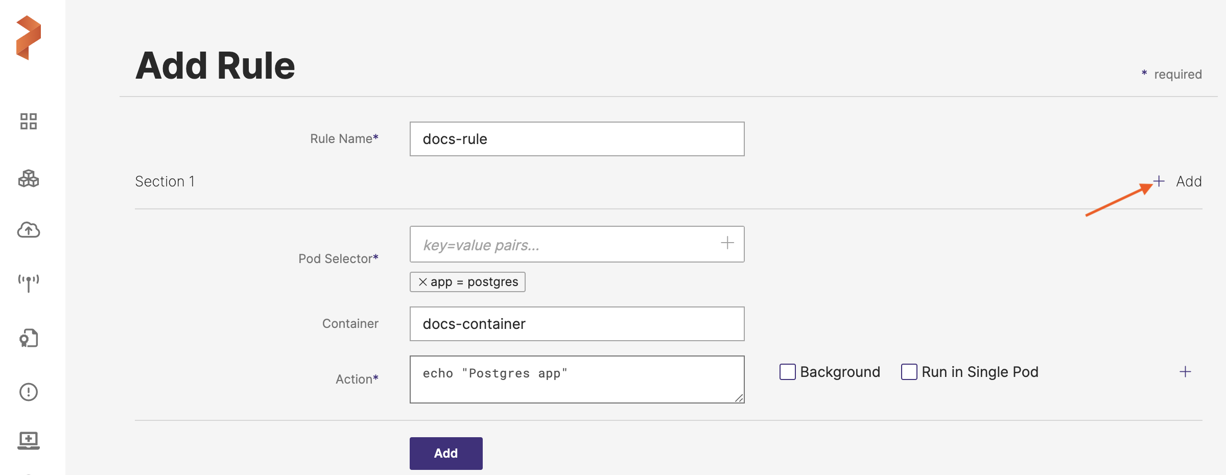 Some applications may only require freeze or pre-exec rules. If you want to add multiple instructions to a rule, you can add sub-rules. For example, while backing up an Elasticsearch application, you can add a sub-rule for a health check along with freeze operation.