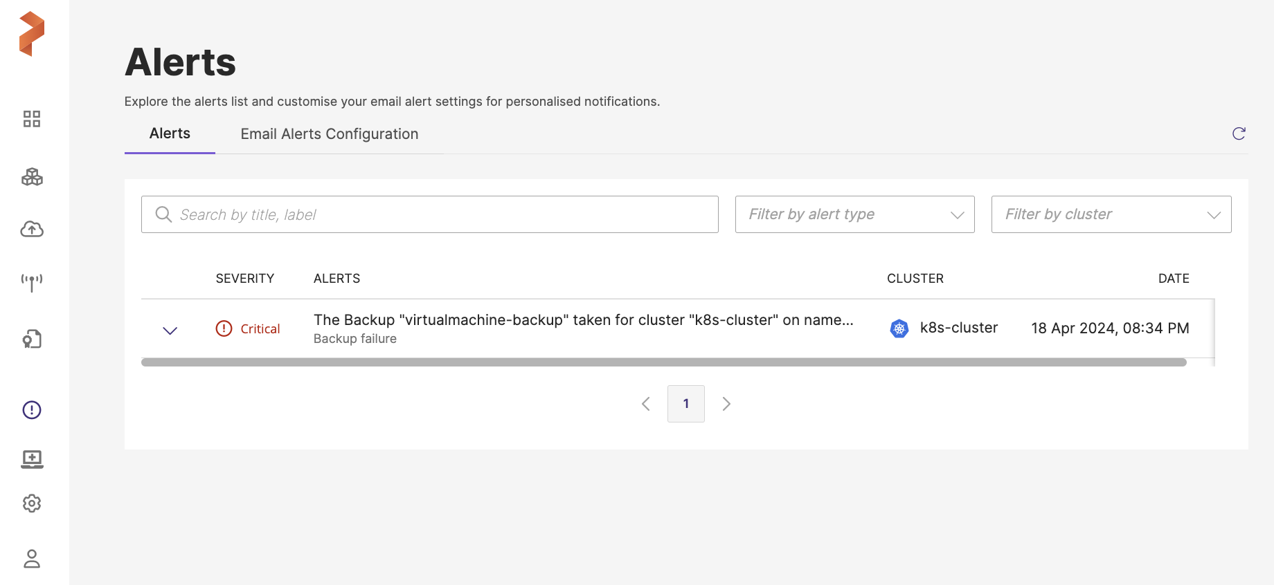 Filter by cluster: drop-down menu to filter alerts by the cluster they pertain to