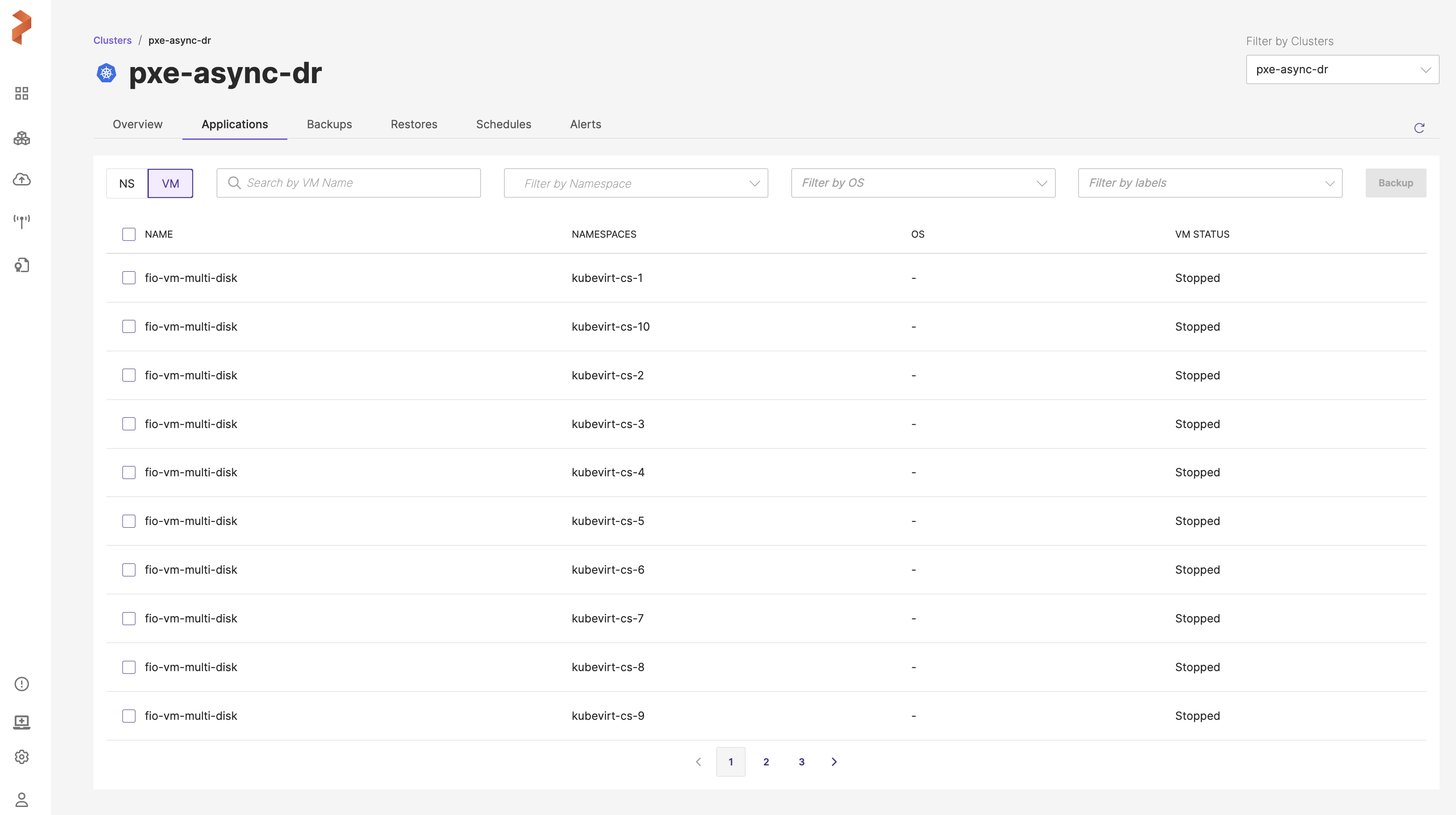 The Applications tab displays the list of Kubernetes Namespaces (NS) and Virtual Machines (VM) for the selected cluster. Users can browse, filter, and select namespaces or Virtual machines to initiate backups.